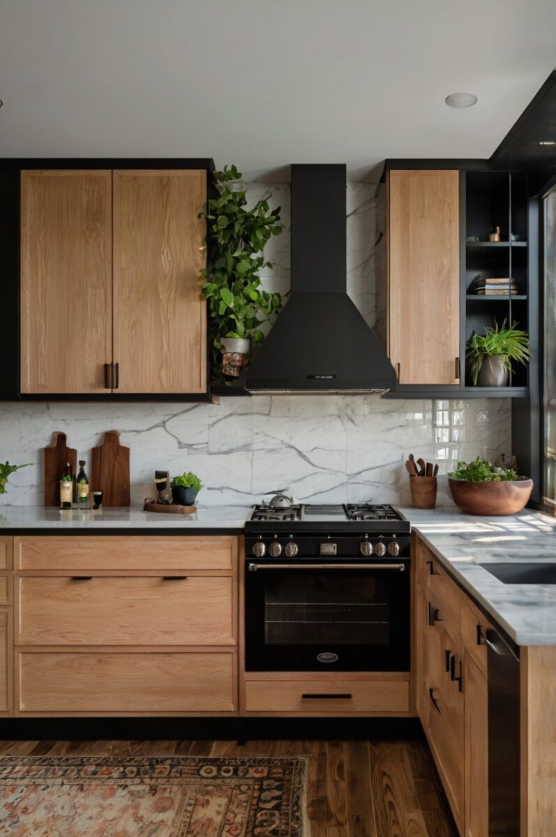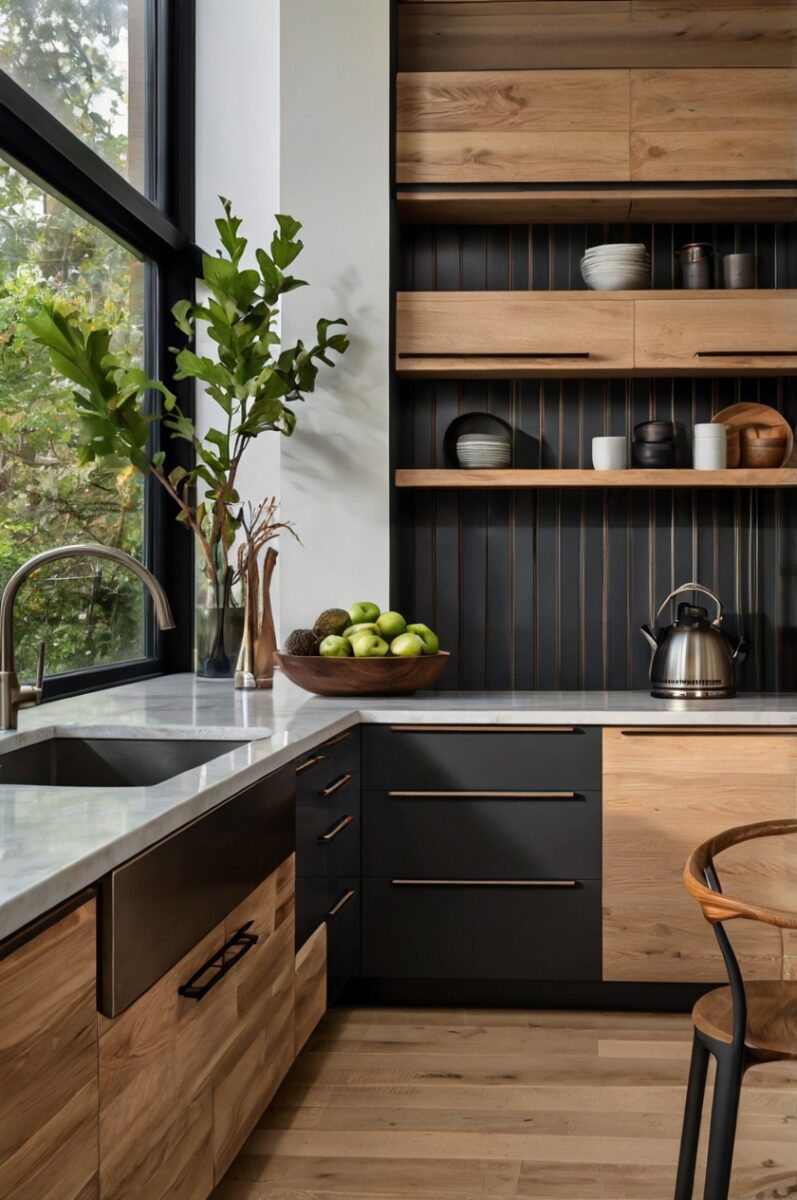 Imagine walking into a kitchen that perfectly balances warmth and sophistication, where natural wood tones meet bold black accents in perfect harmony.