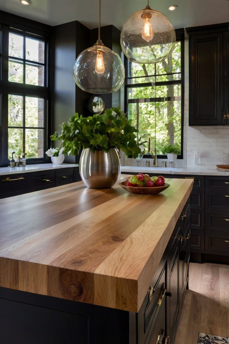 Functional Beauty: White Oak Butcher Block Countertops on Dramatic Black Base Cabinets