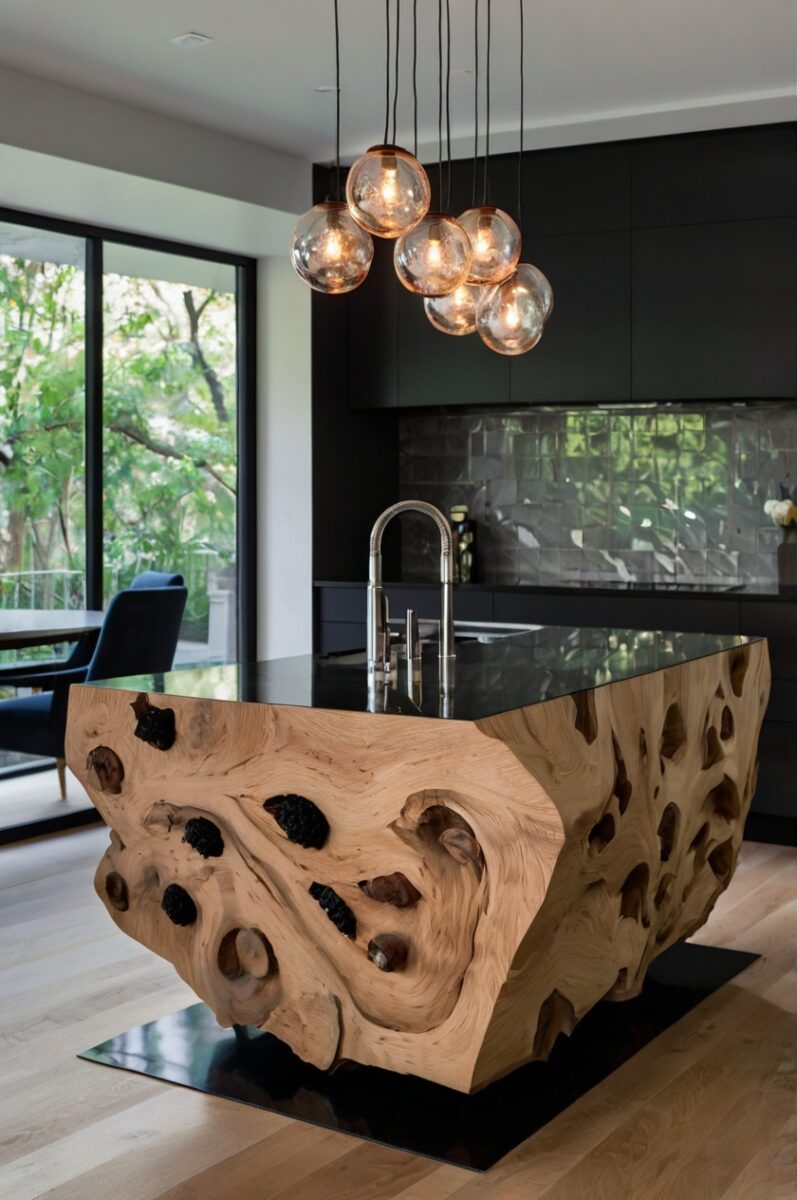 Your kitchen gains artisanal appeal when you choose live-edge slabs that showcase the wood’s natural beauty and unique characteristics.