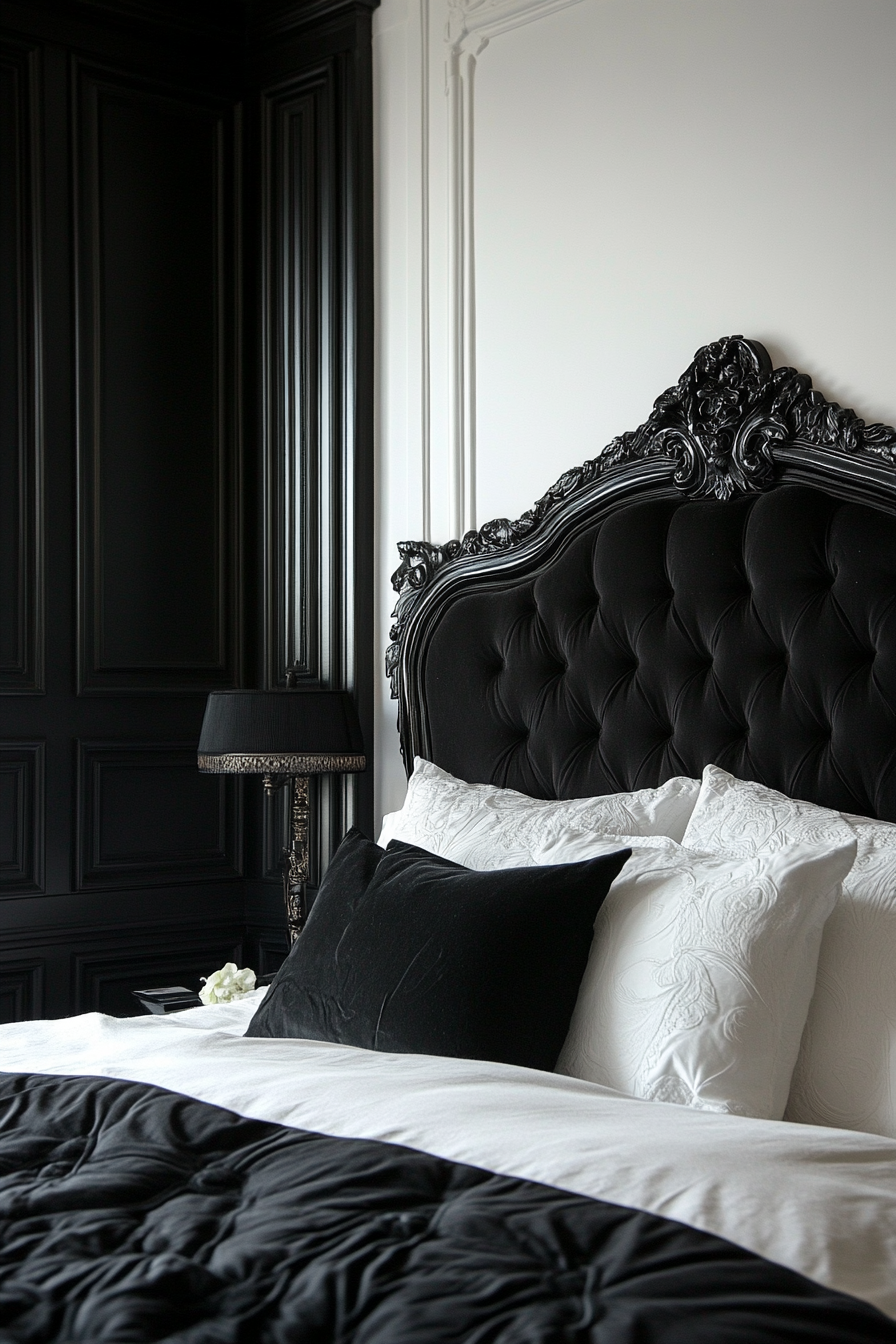 Make the bedroom feel luxurious and tailored by upholstering the headboard in black fabric.