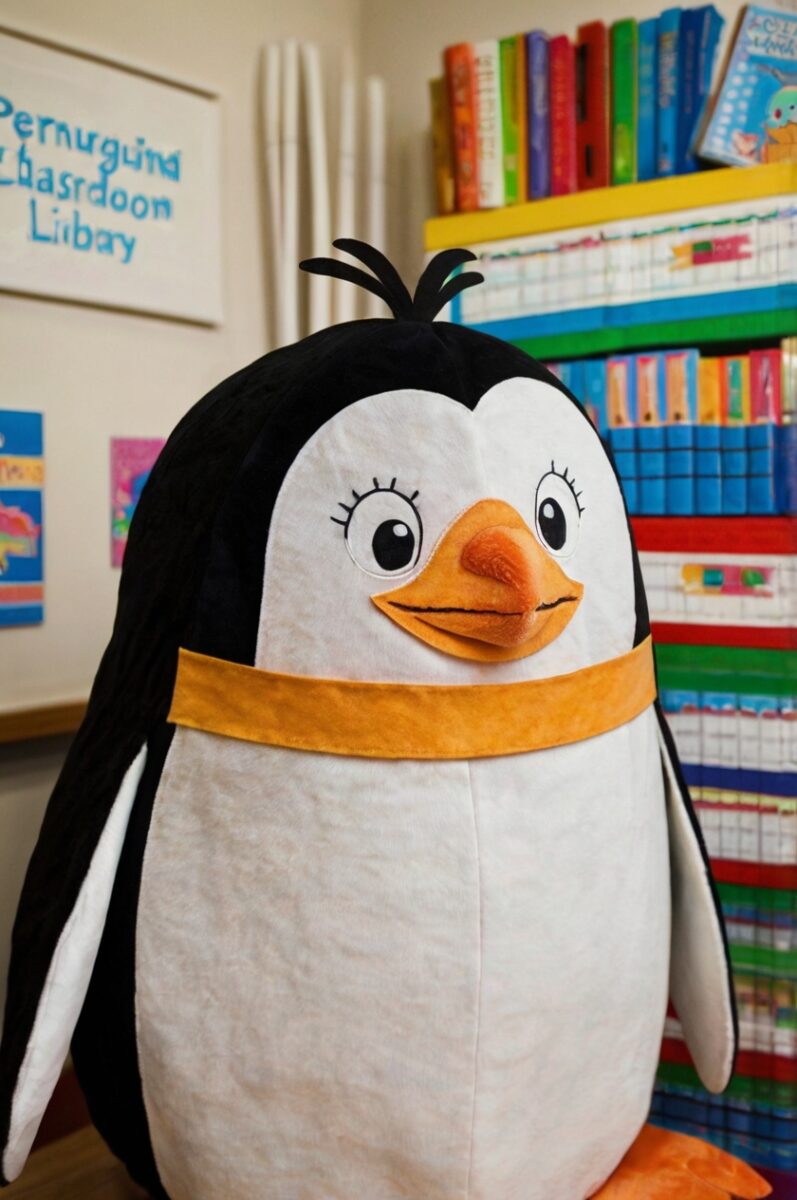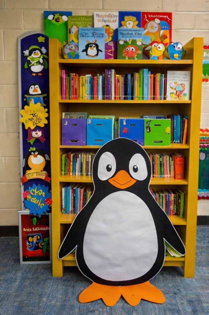 Include a cozy corner with blankets and soft lighting where students can enjoy quiet reading time surrounded by their penguin friends.