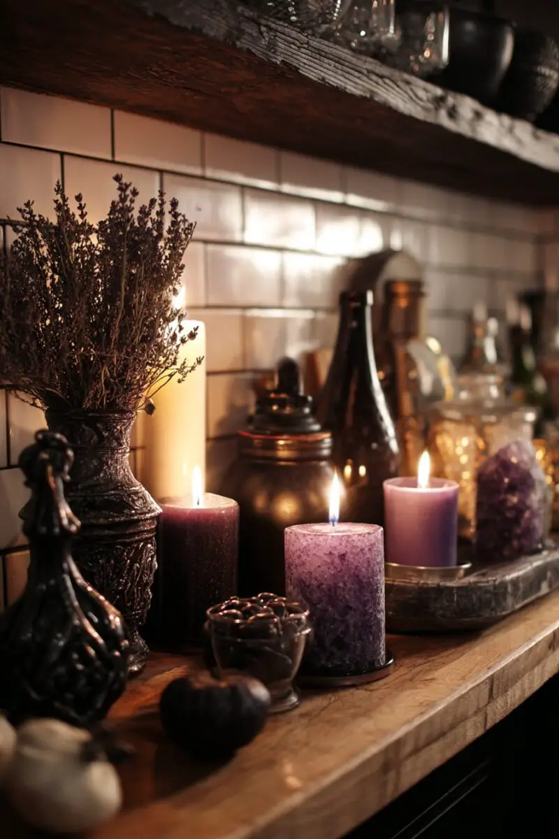 Group candles with natural elements like pinecones, crystals, or dried flowers to create small altar spaces throughout your kitchen.