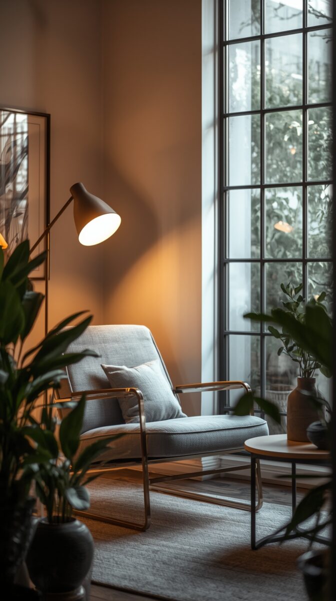 Opt for warm lighting with a table lamp or string lights instead of harsh overhead lighting to make the room feel softer and more intimate.