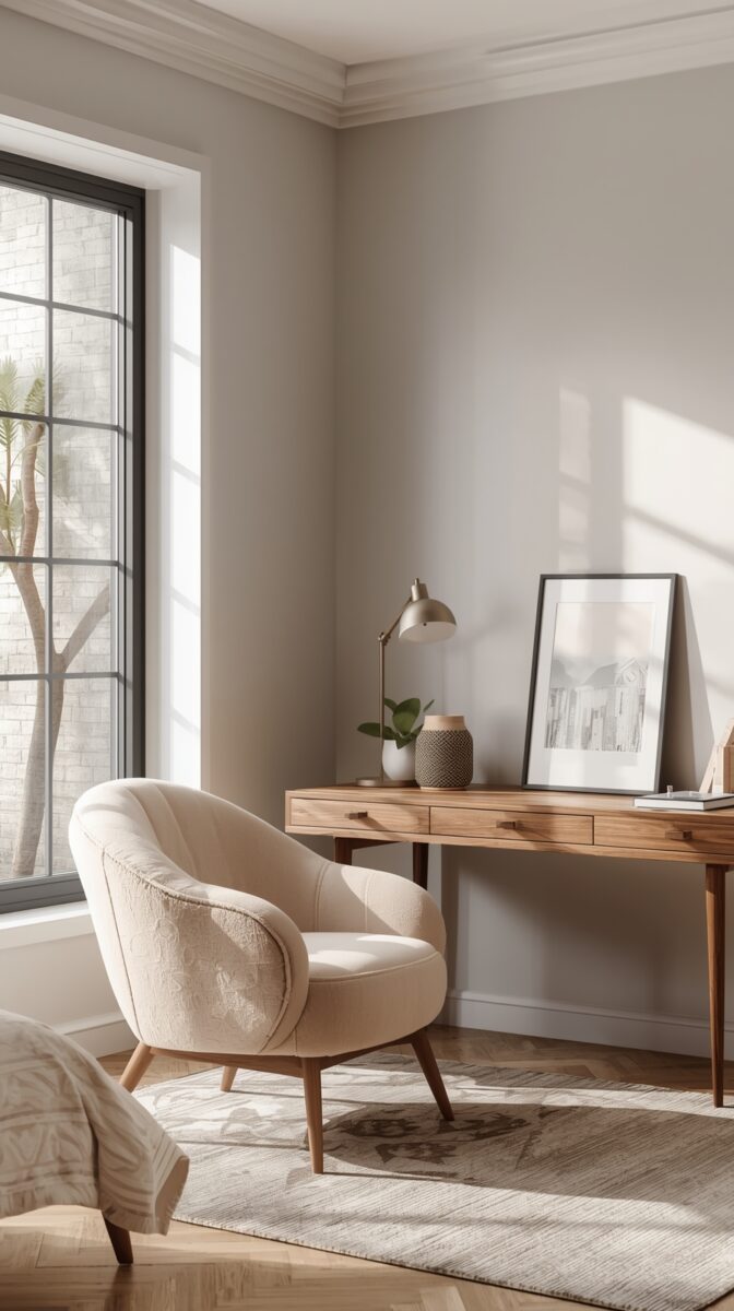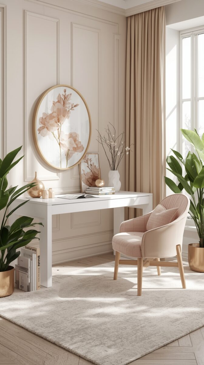 A neutral color palette is the foundation of a chic and feminine home office, as soft, understated hues create a calm environment that helps you focus while providing a sophisticated backdrop for your decor.