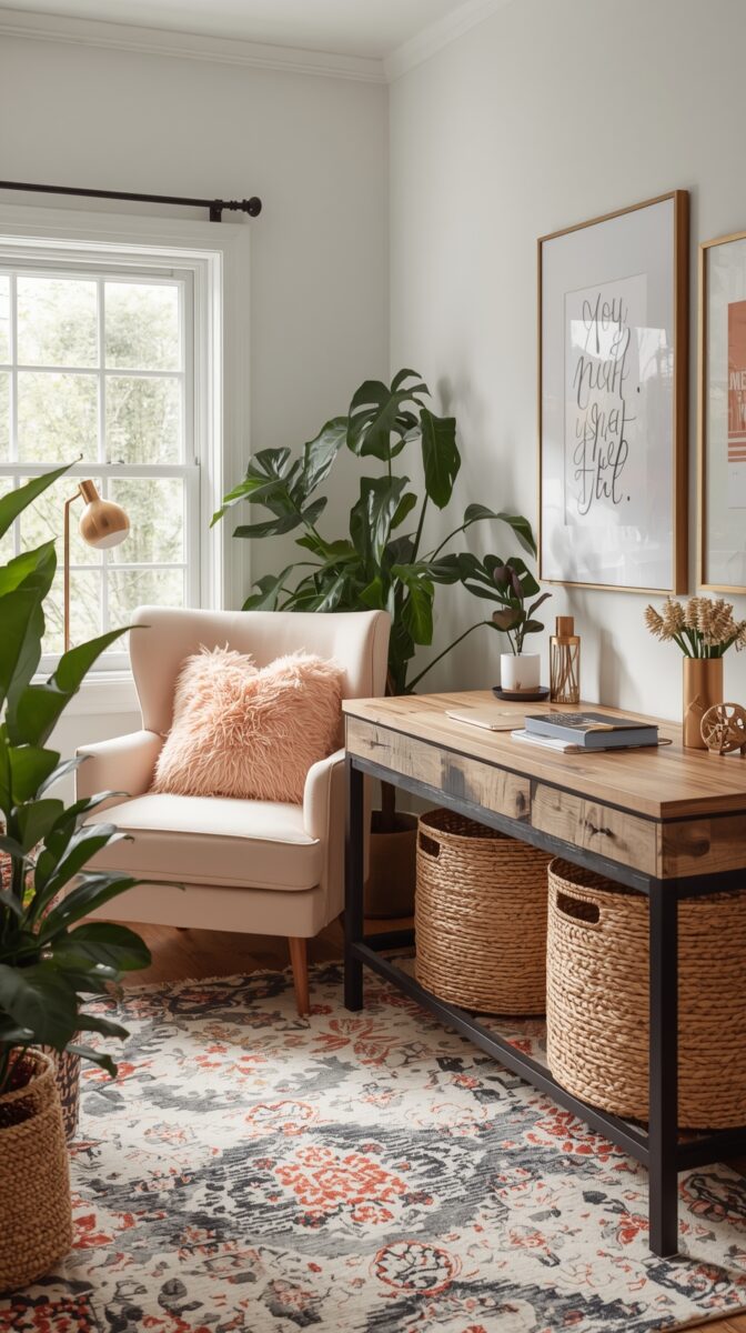 Plants are an easy way to brighten up any space, and adding greenery to your feminine home office not only makes the room more attractive but also improves air quality and creates a calming atmosphere.