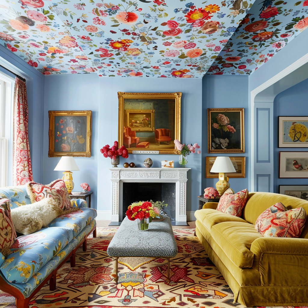 Covering the entire ceiling in wallpaper makes a bold statement.