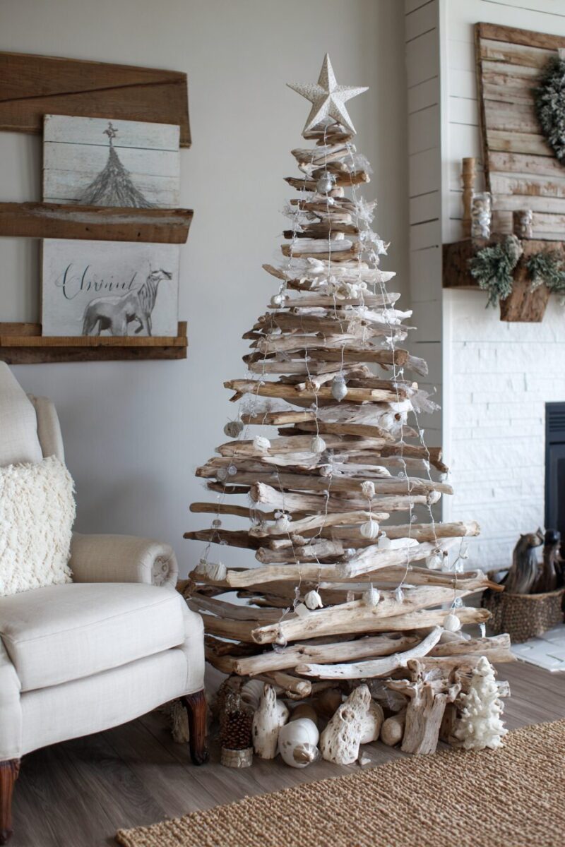 The irregular shapes and varying thicknesses of driftwood branches create beautiful negative spaces perfect for showcasing special ornaments or letting string lights peek through.