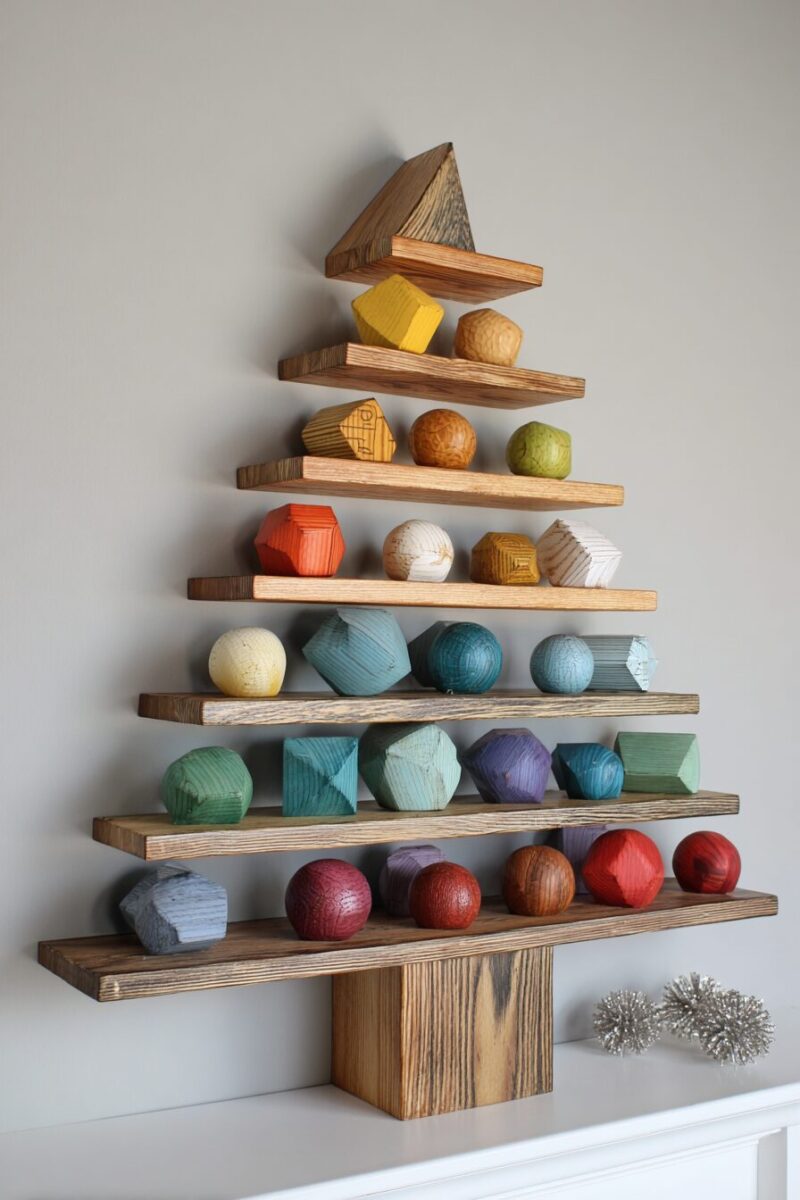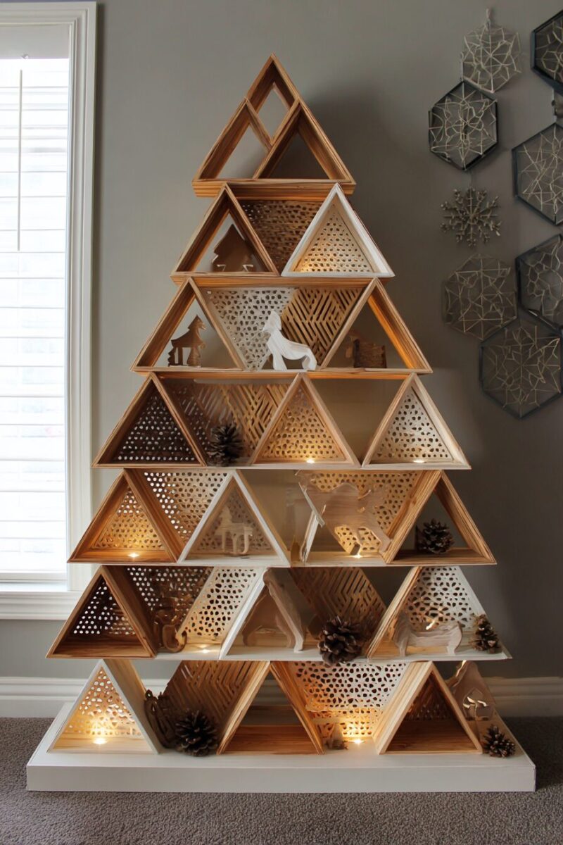 The genius of this design is how the negative space between shelves creates the classic triangle shape while giving you multiple surfaces for displaying ornaments, small plants, or LED string lights.