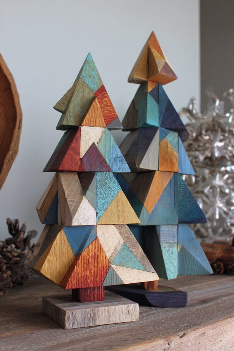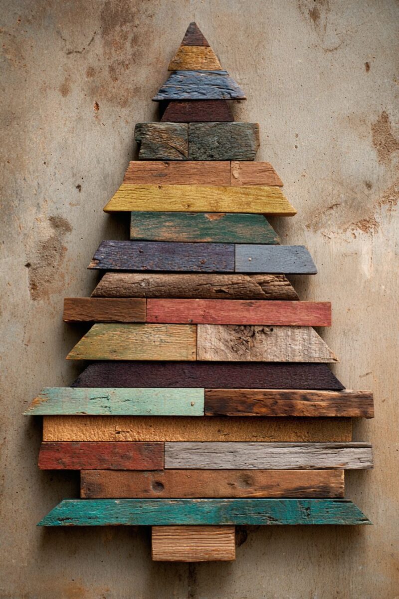 The irregular widths and lengths of reclaimed lumber create an organic, asymmetrical tree that feels natural and unforced.