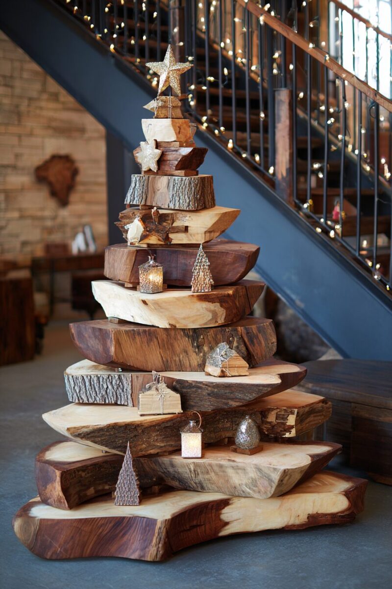 Channel your inner lumberjack with a tree that celebrates the raw, natural beauty of freshly cut logs arranged in a stunning pyramid formation.