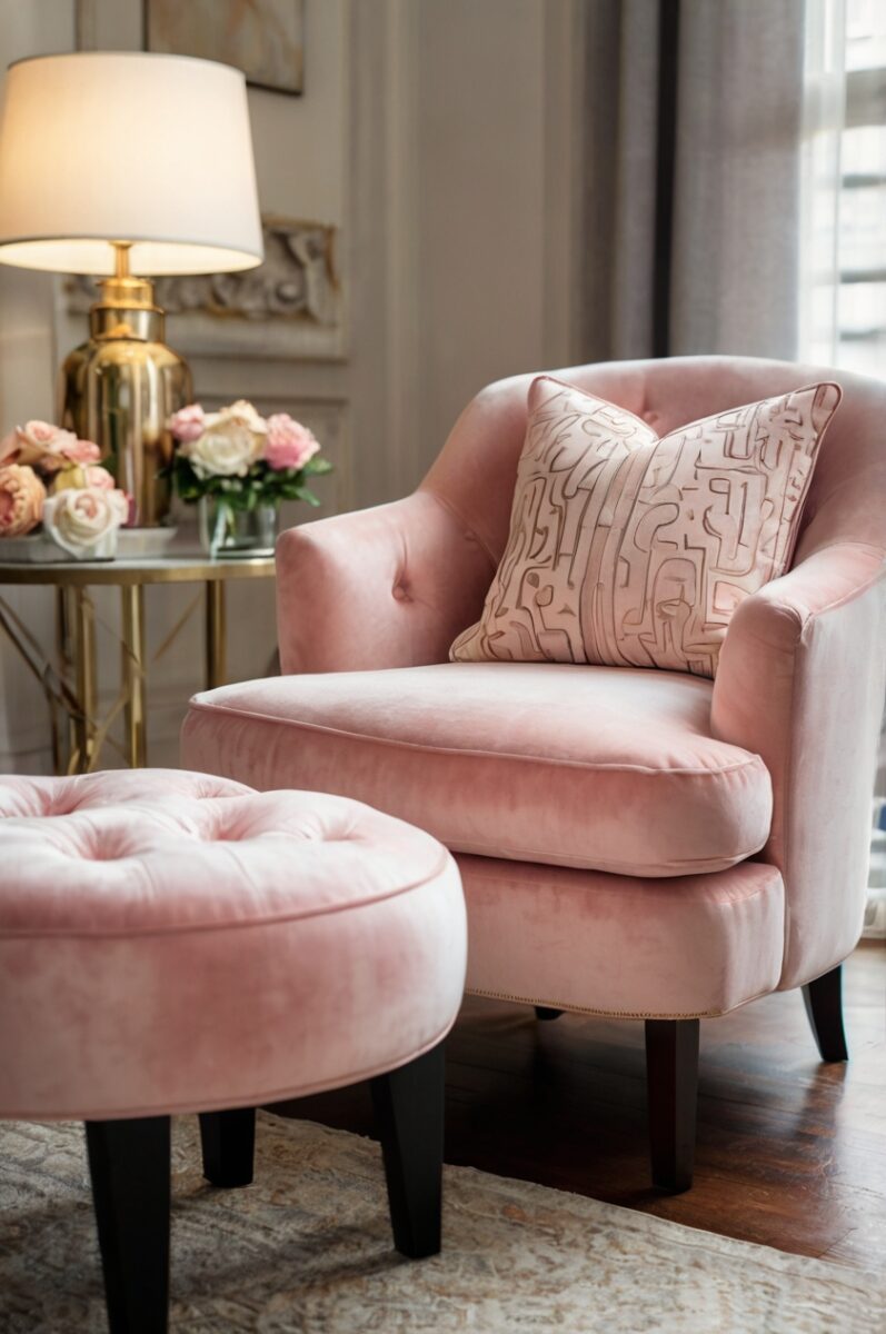 Pair the chair with feather-filled blush pink velvet throw pillows in varying shades and patterns for plenty of cushy comfort.