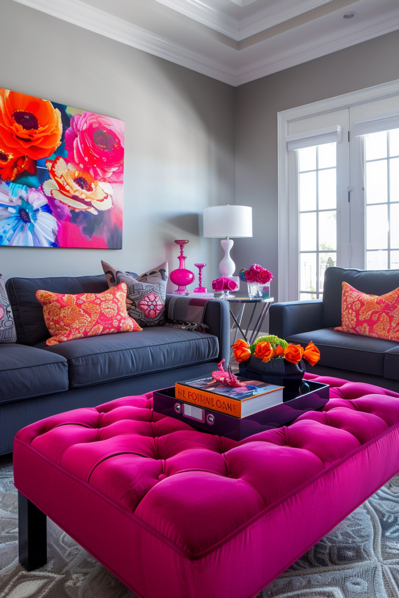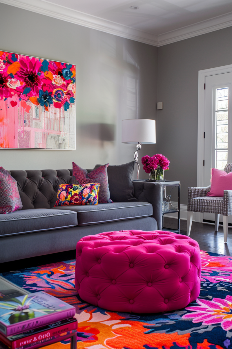 Energize your living room with the playful combination of bubblegum pink and heather gray.