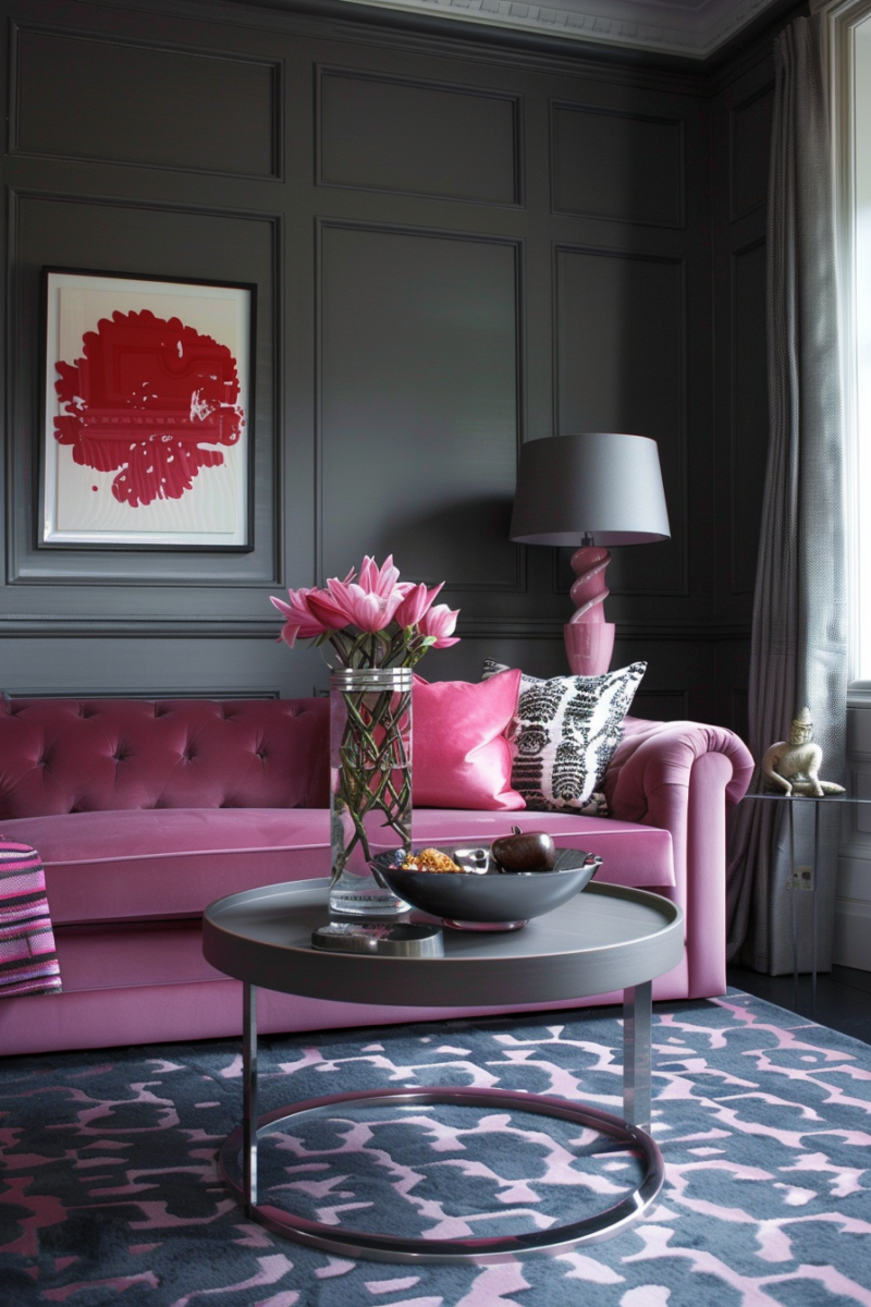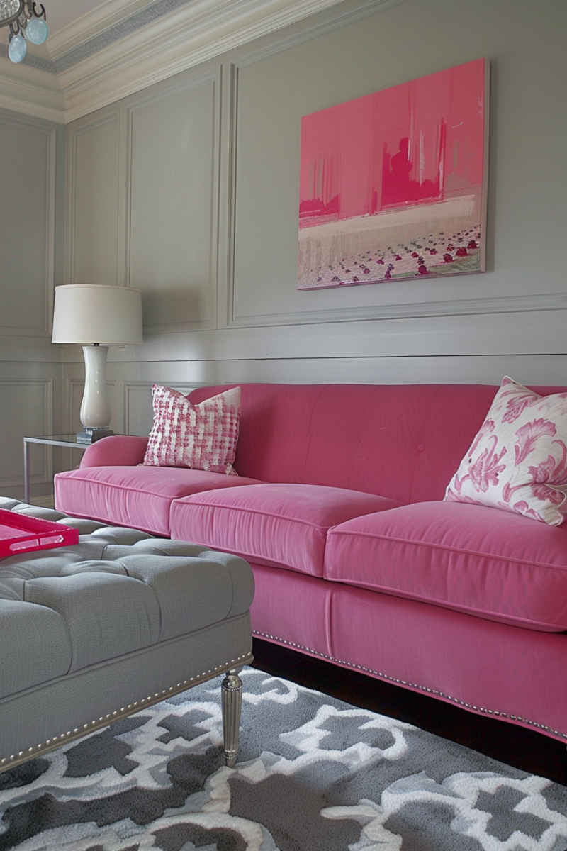Make a statement by pairing a pink velvet sofa with sleek and modern gray accents.