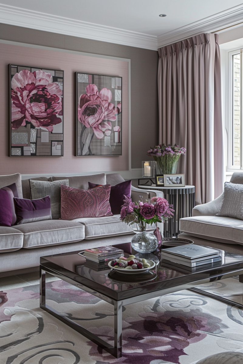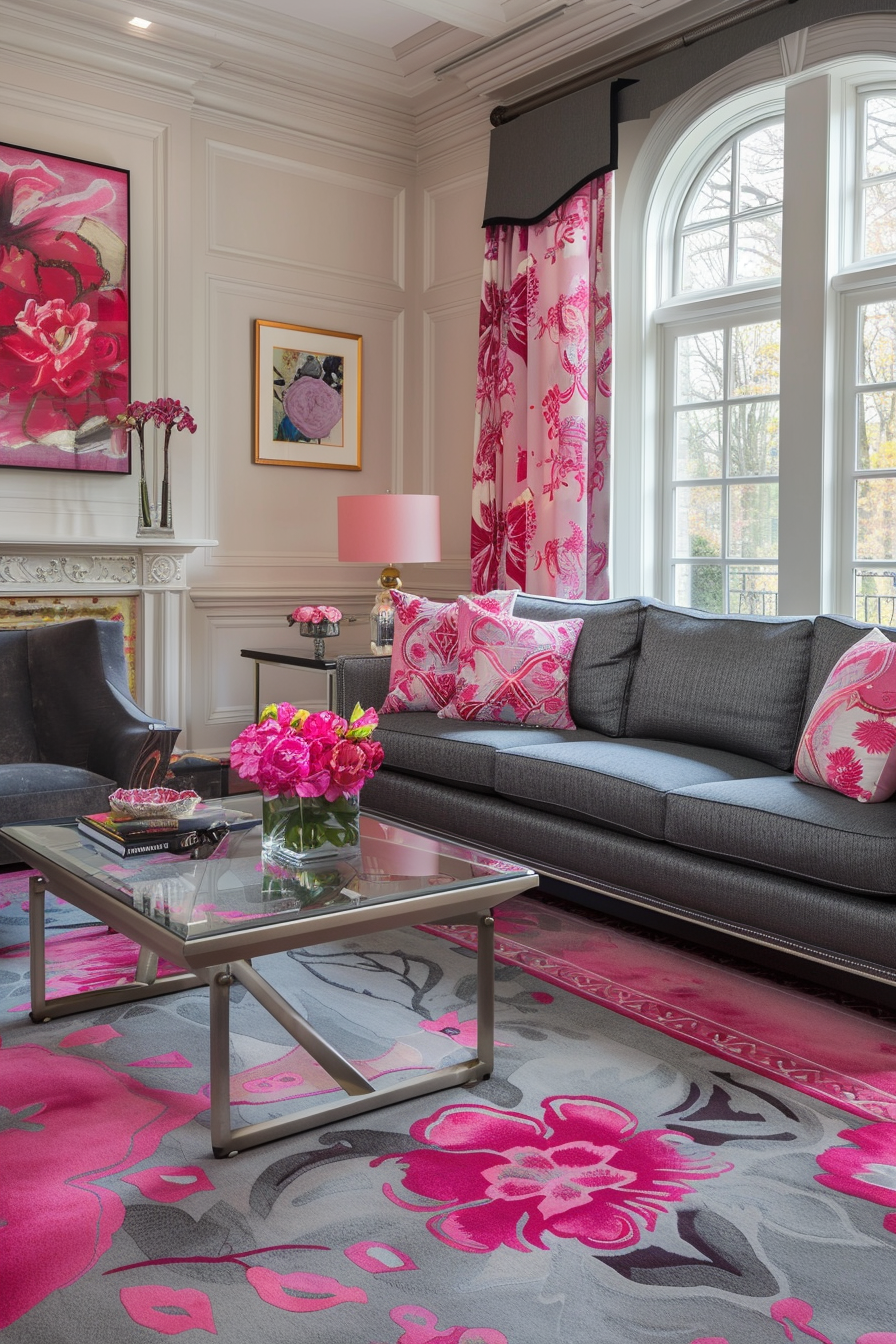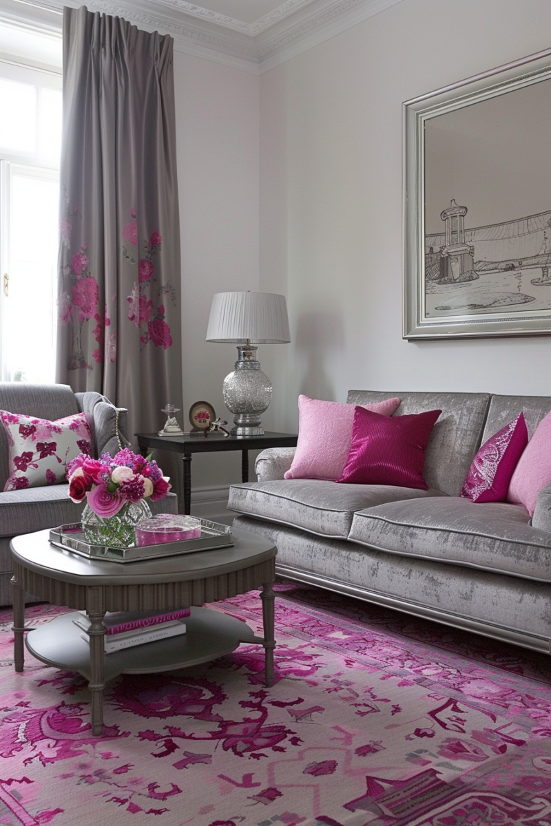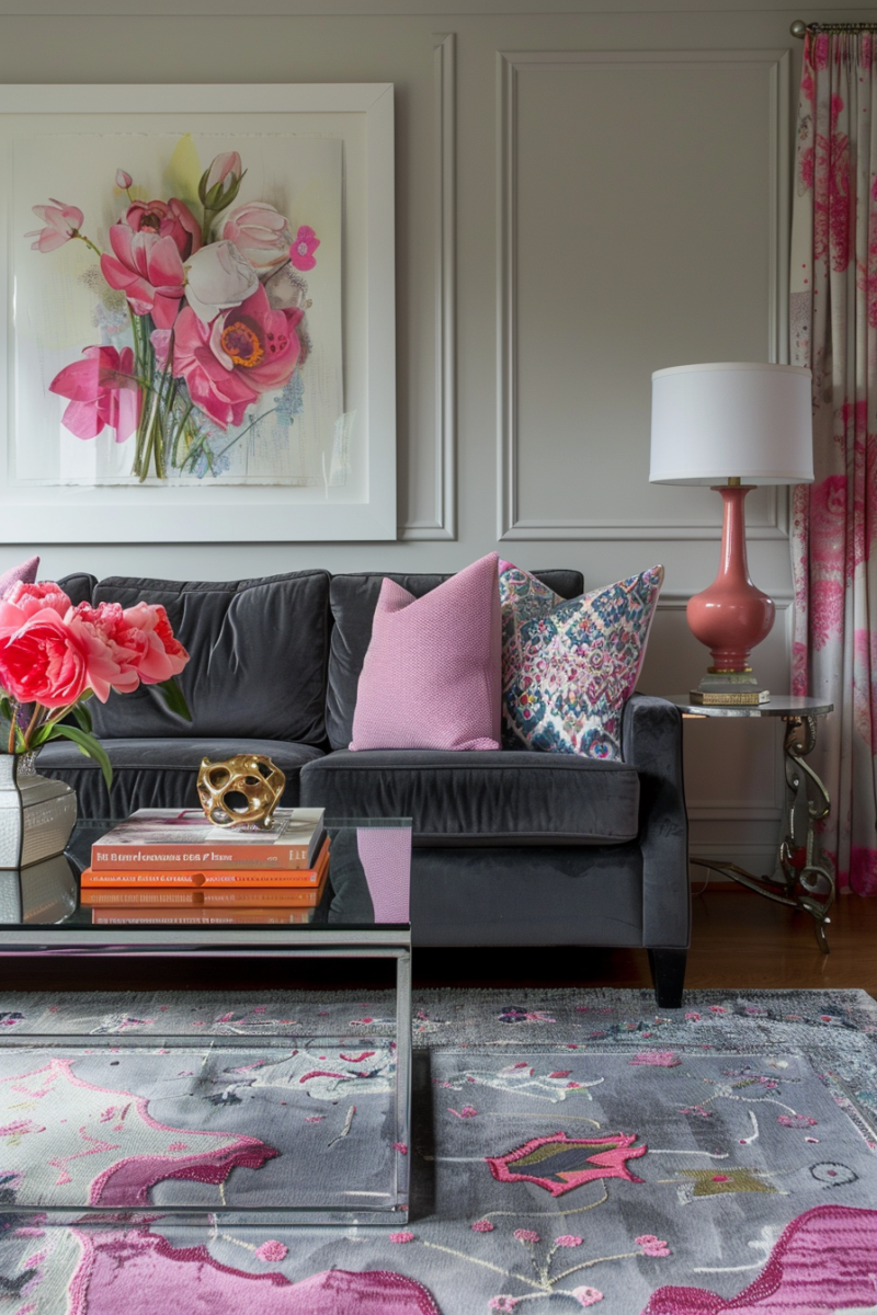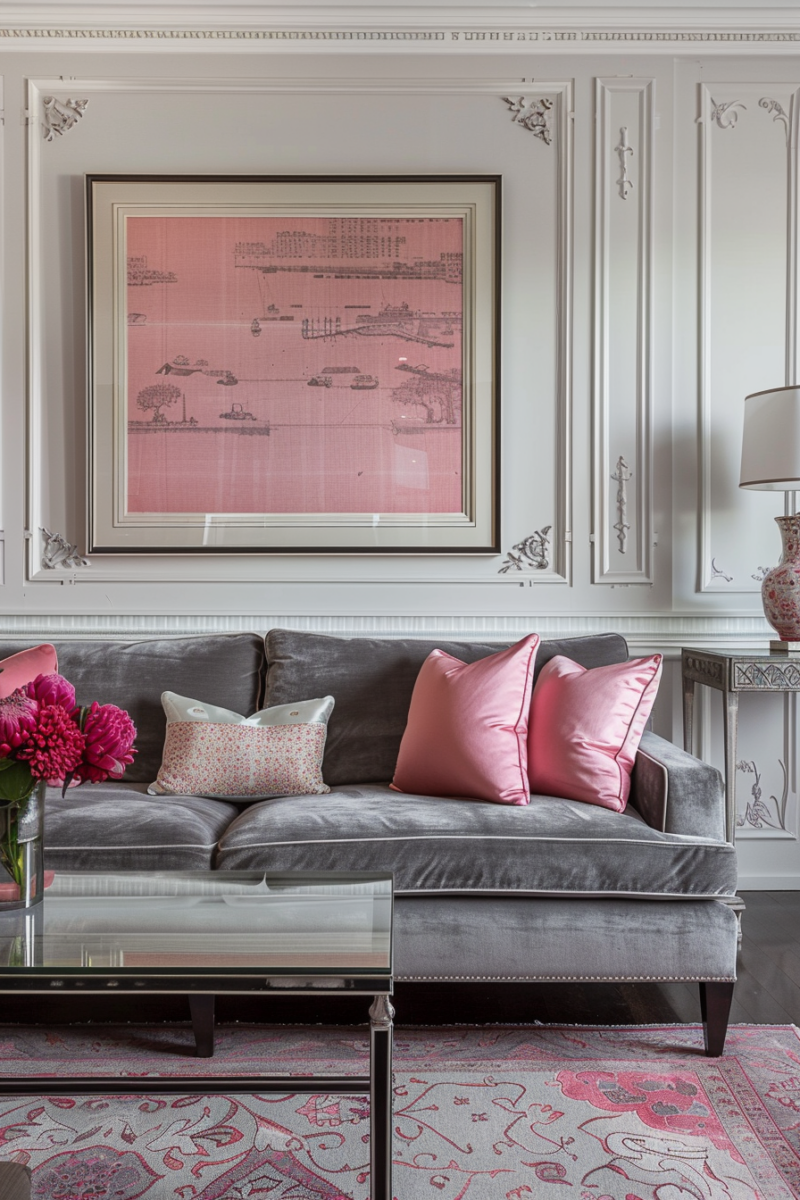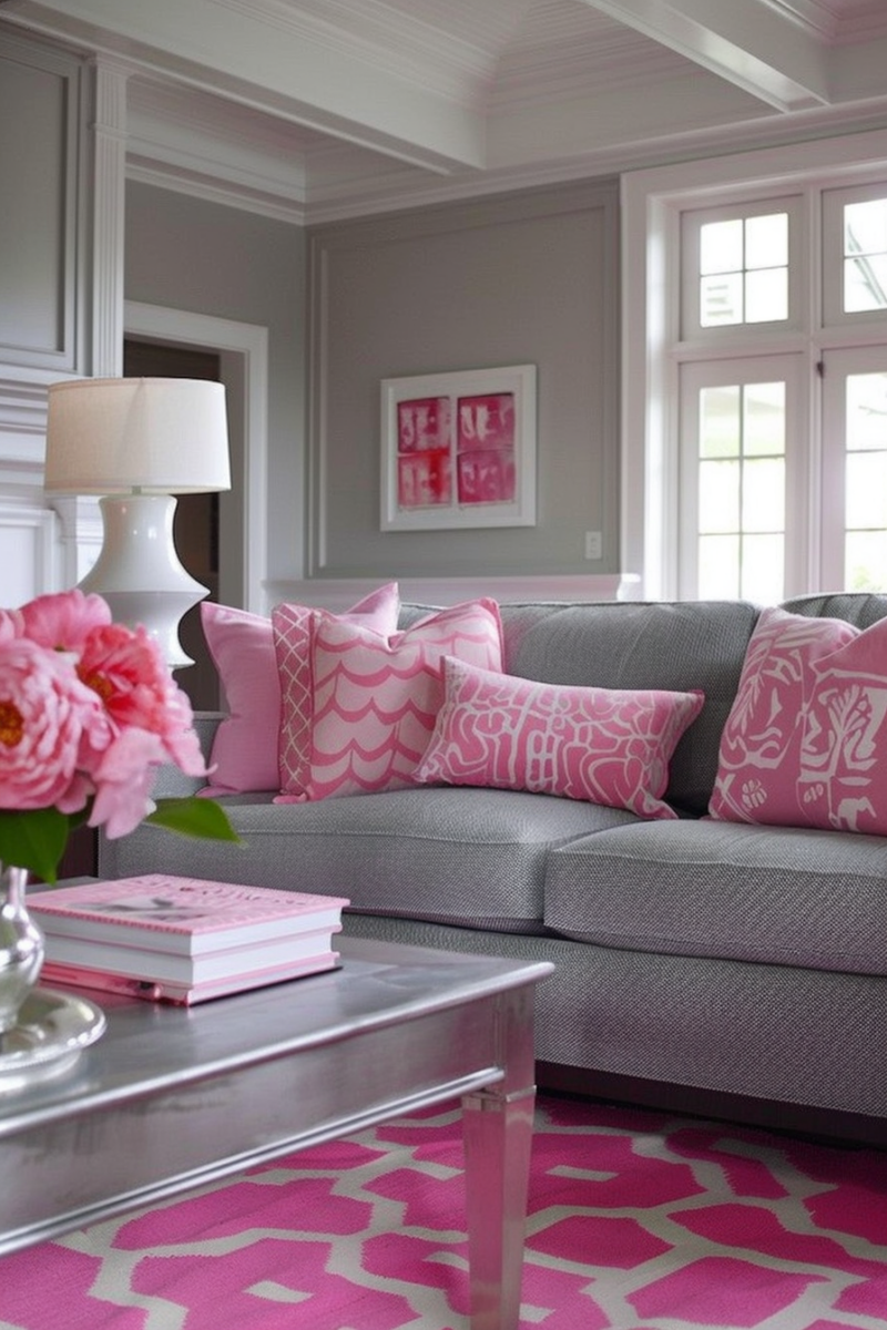 Pink and gray fuse playfulness and elegance to create a charming living room color combination.