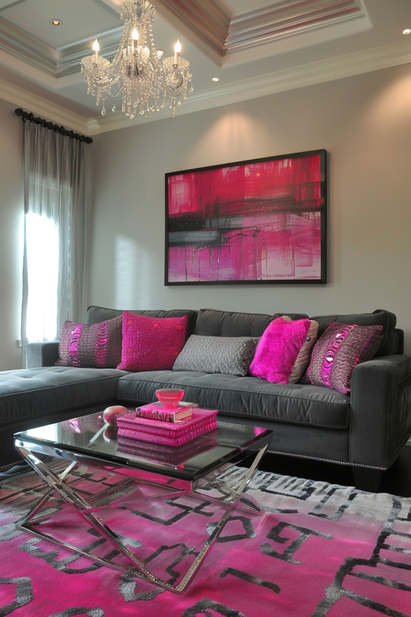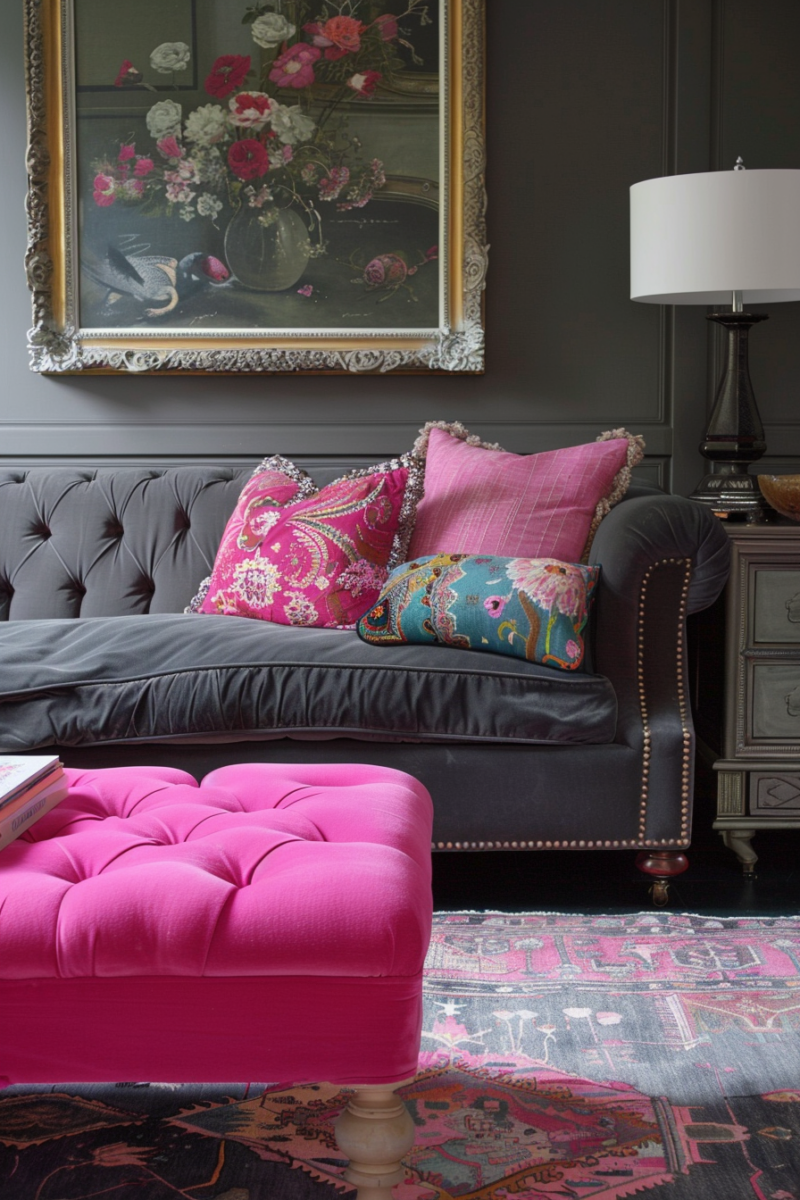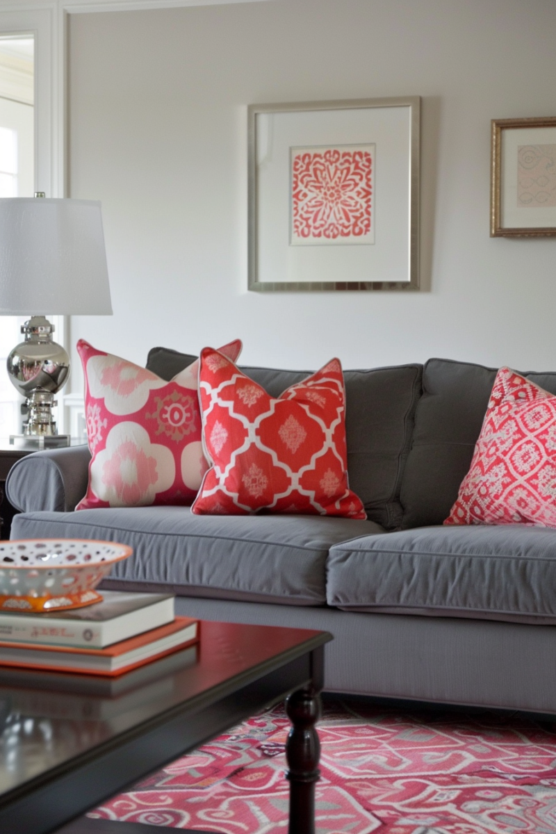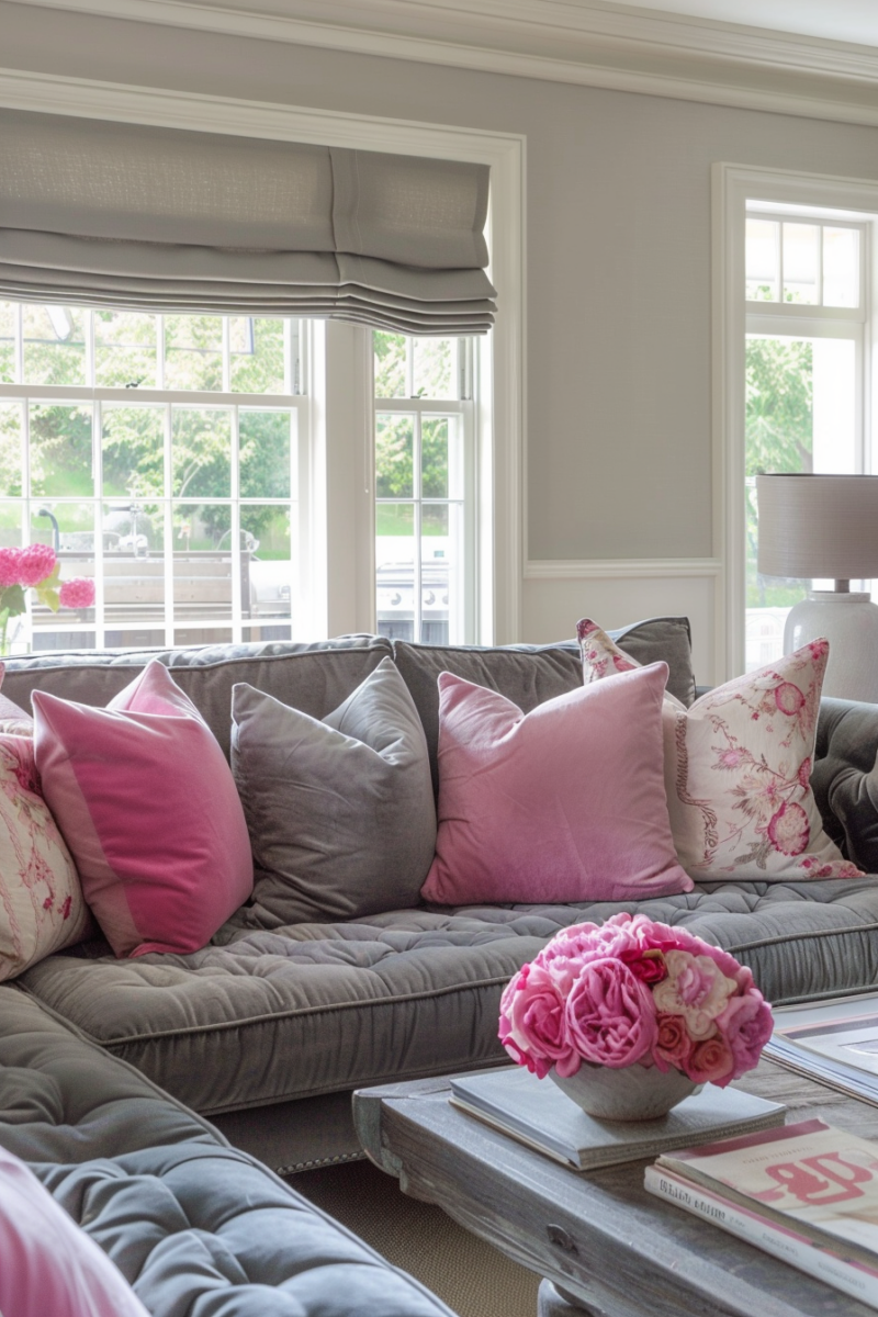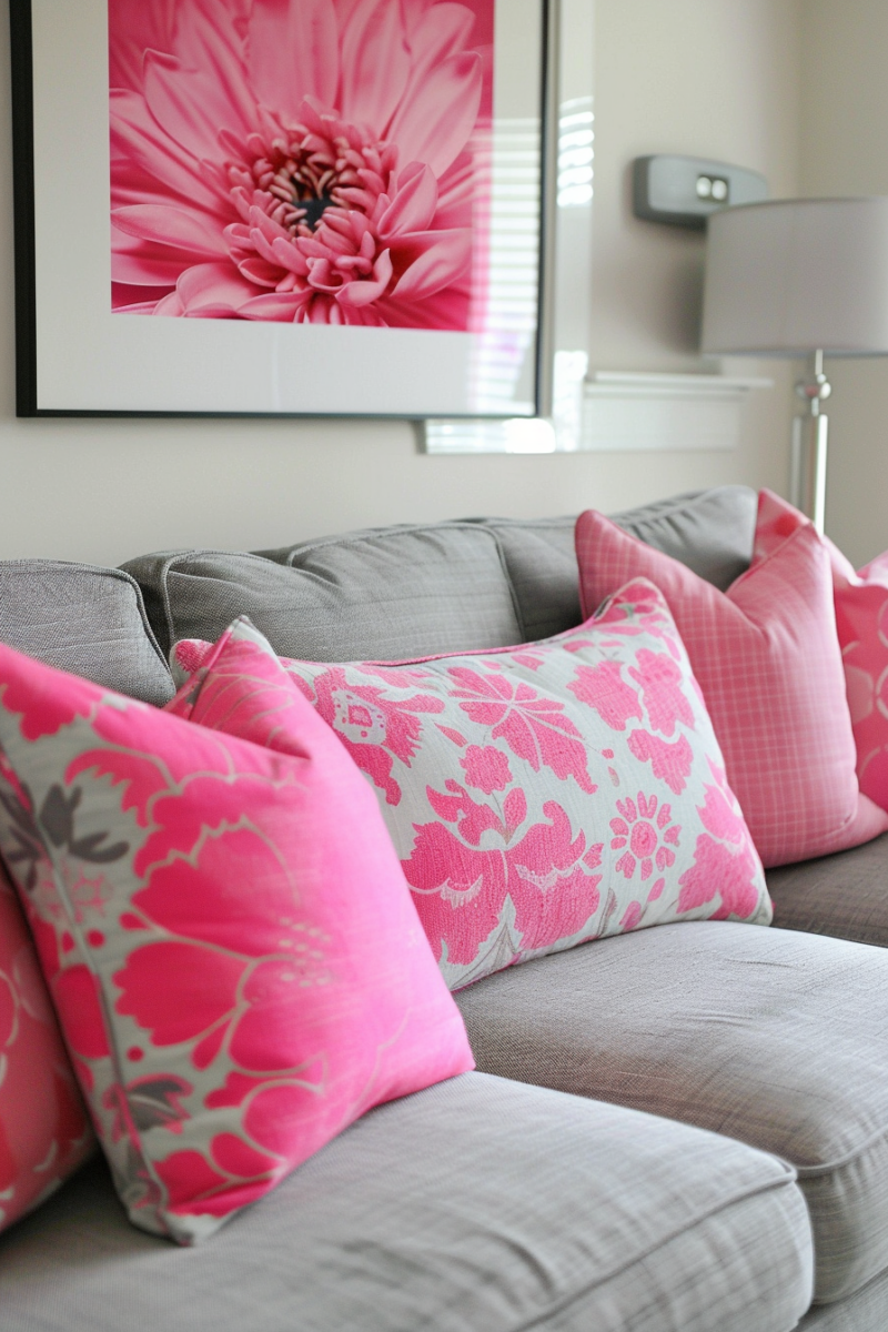 With just a few vibrant pink pillows, you can transform a basic gray sofa into a lively centerpiece that feels both relaxed and put-together.