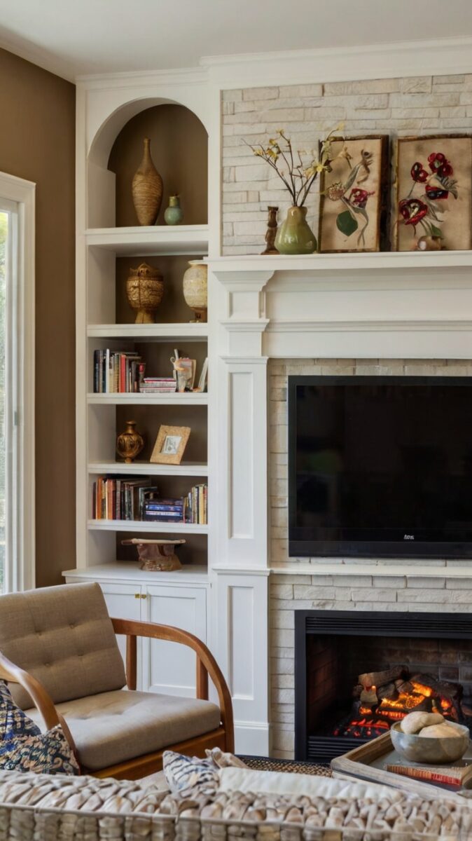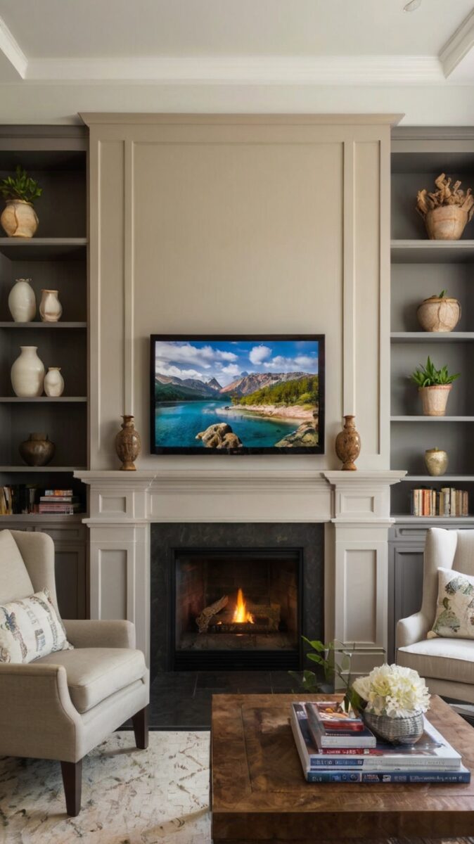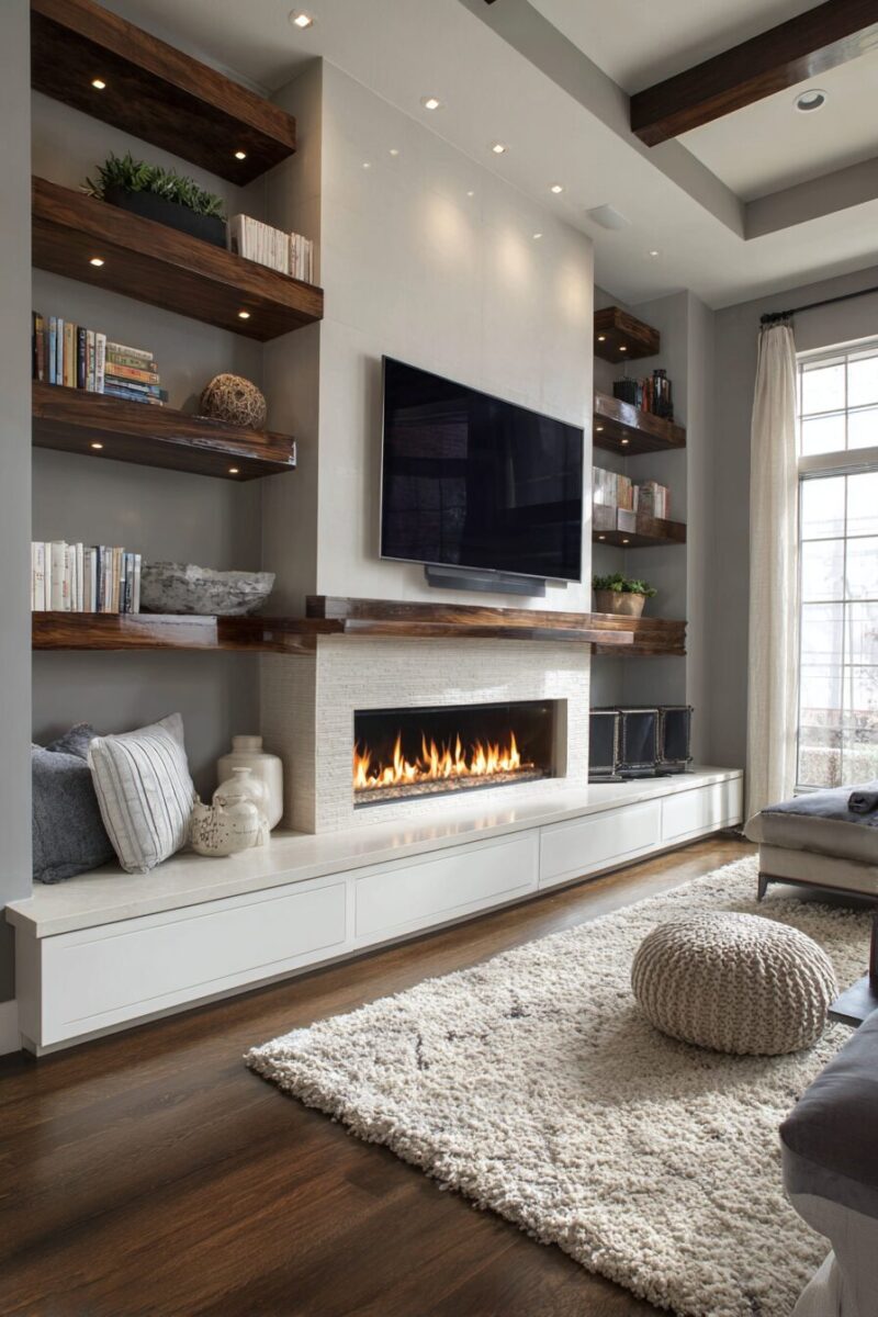 Picture this: your TV mounted above a sleek fireplace, surrounded by carefully curated floating shelves that seem to defy gravity.