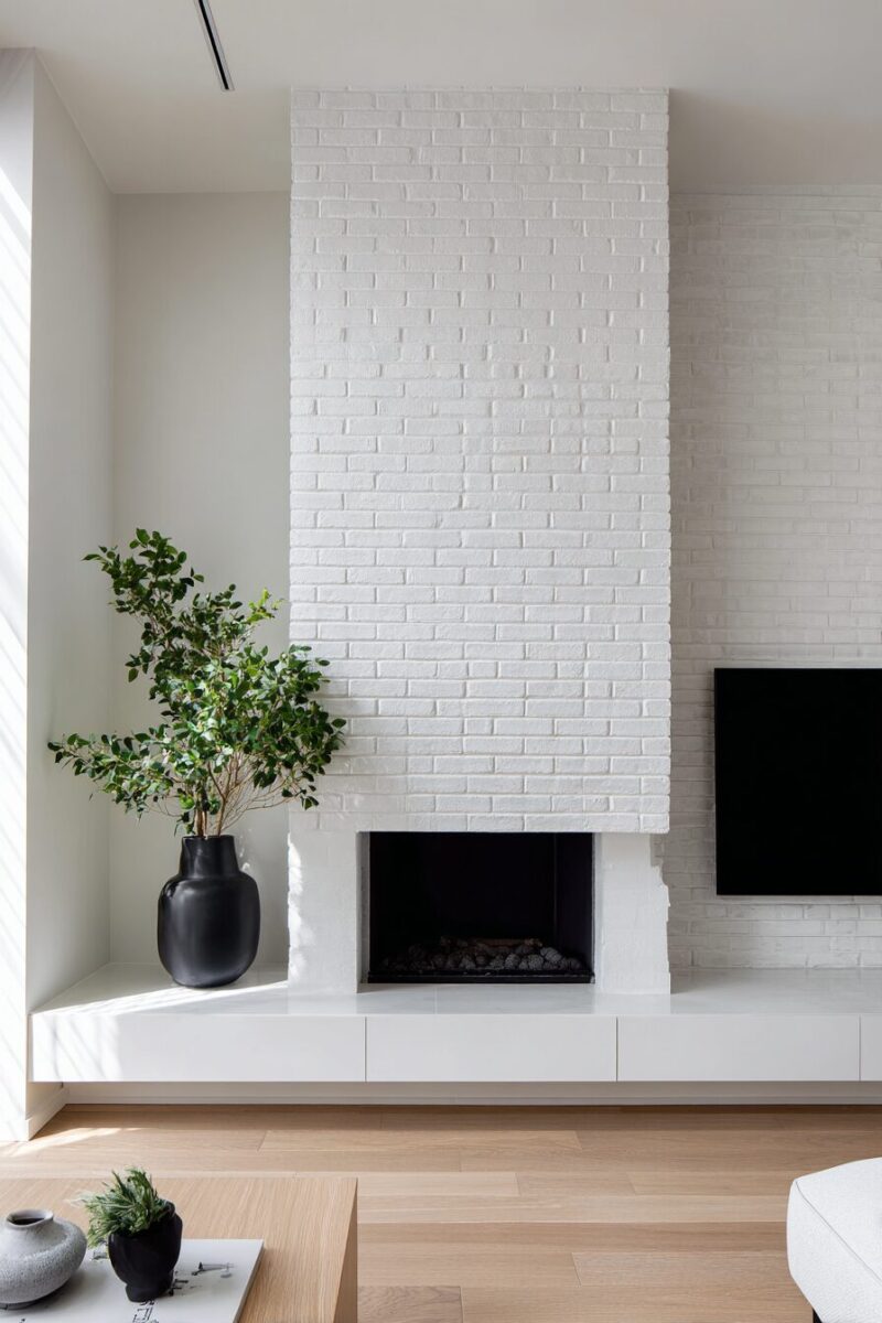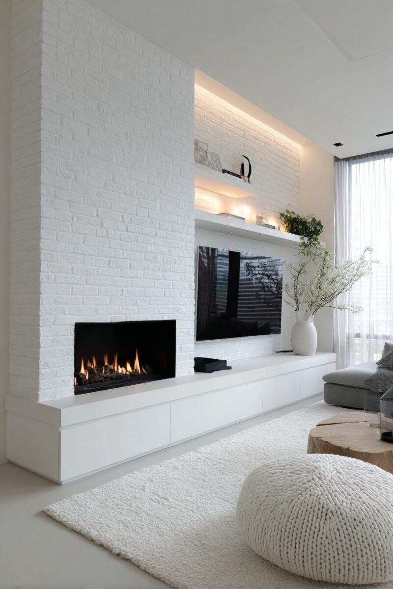 Embrace the beauty of simplicity with a stunning white brick fireplace wall that provides subtle texture while maintaining the clean, uncluttered aesthetic that modern living demands.
