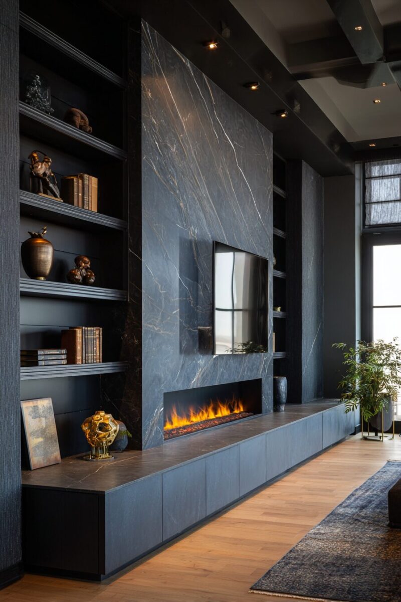 This bold design choice creates instant drama and sophistication while providing the perfect backdrop for both your fireplace and television.