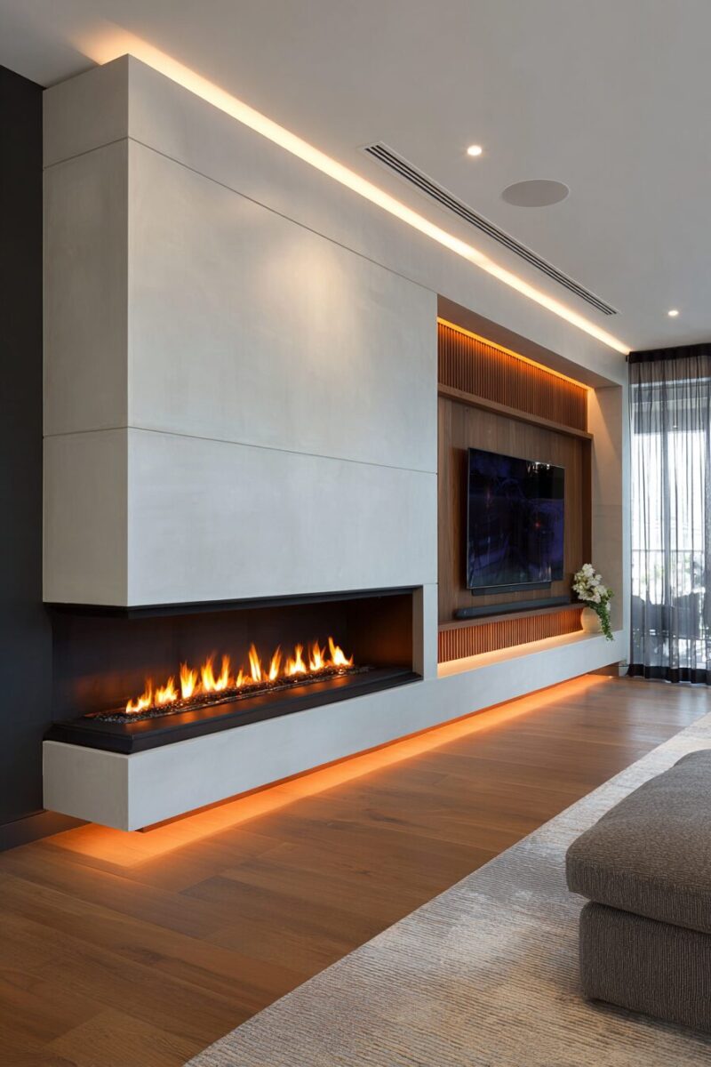 You can enhance the modern aesthetic with floating media consoles on either side of the fireplace or keep things ultra-minimal with hidden storage solutions.