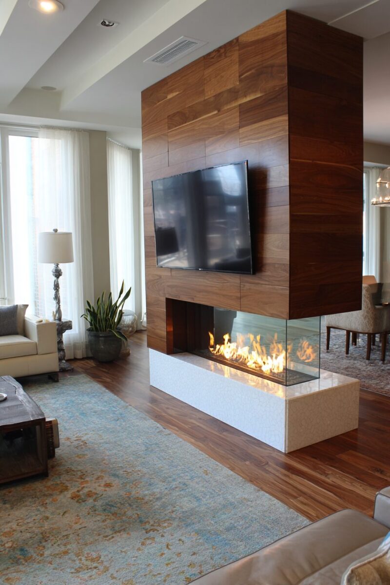 Reimagine your space with a stunning two-sided fireplace that serves as both room divider and entertainment center, creating distinct zones while maintaining visual connection.