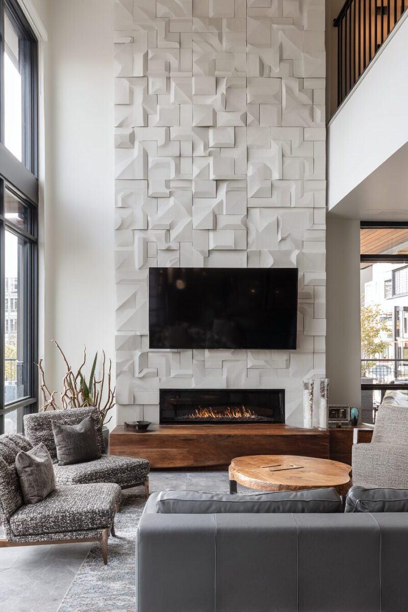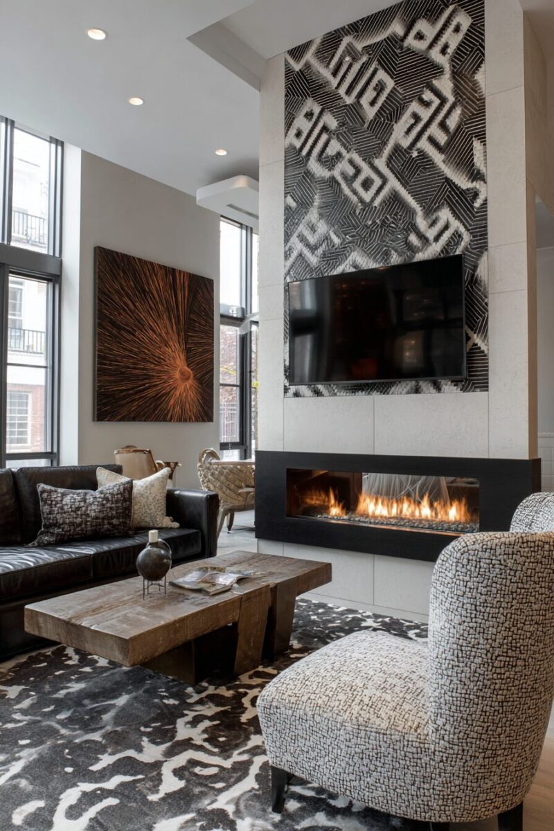 This design approach transforms your wall into a work of art while providing a luxurious backdrop for both your fireplace and television.