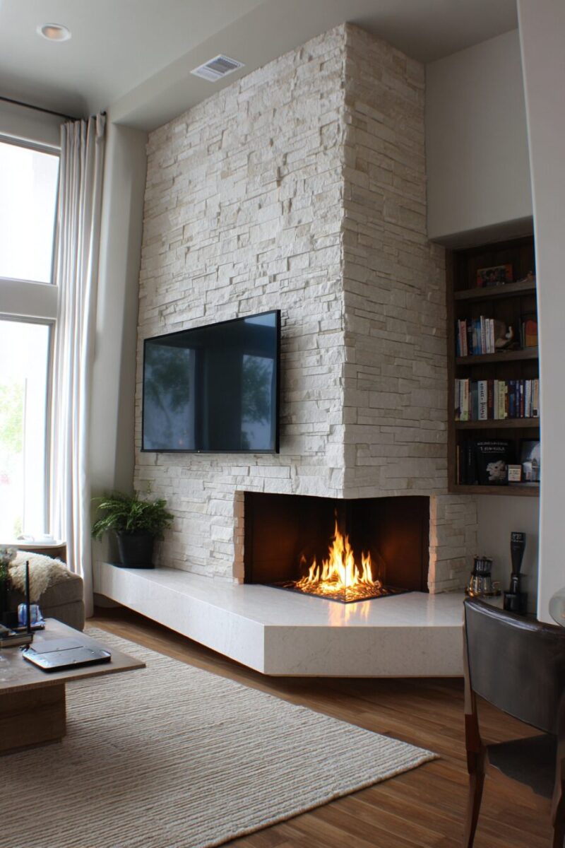Your fireplace hearth can extend into the room using the same stone, creating a unified look that feels intentional and cohesive.