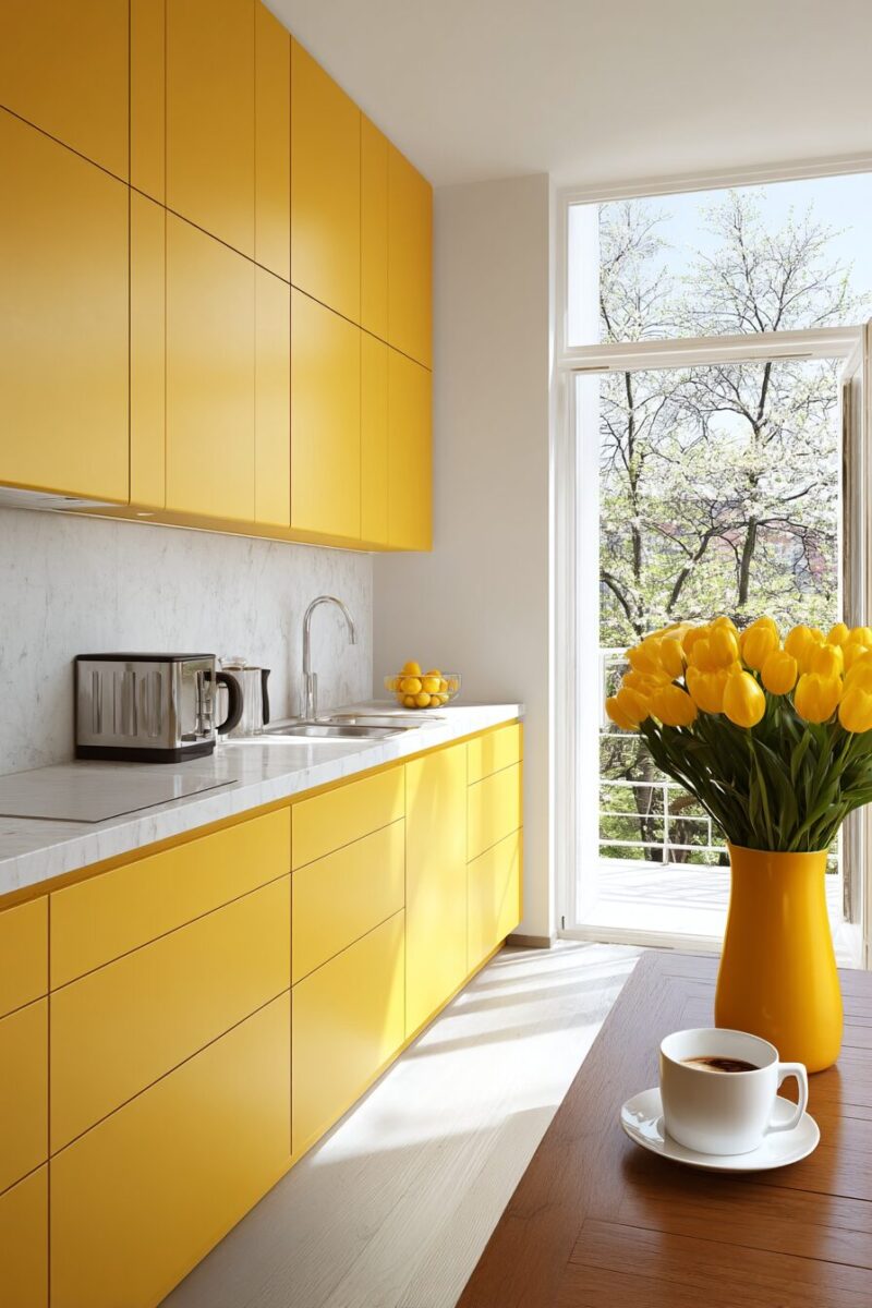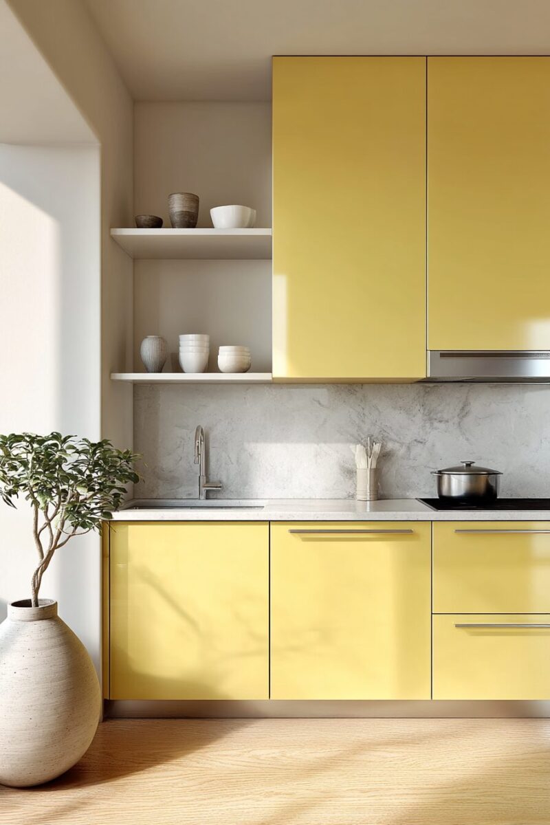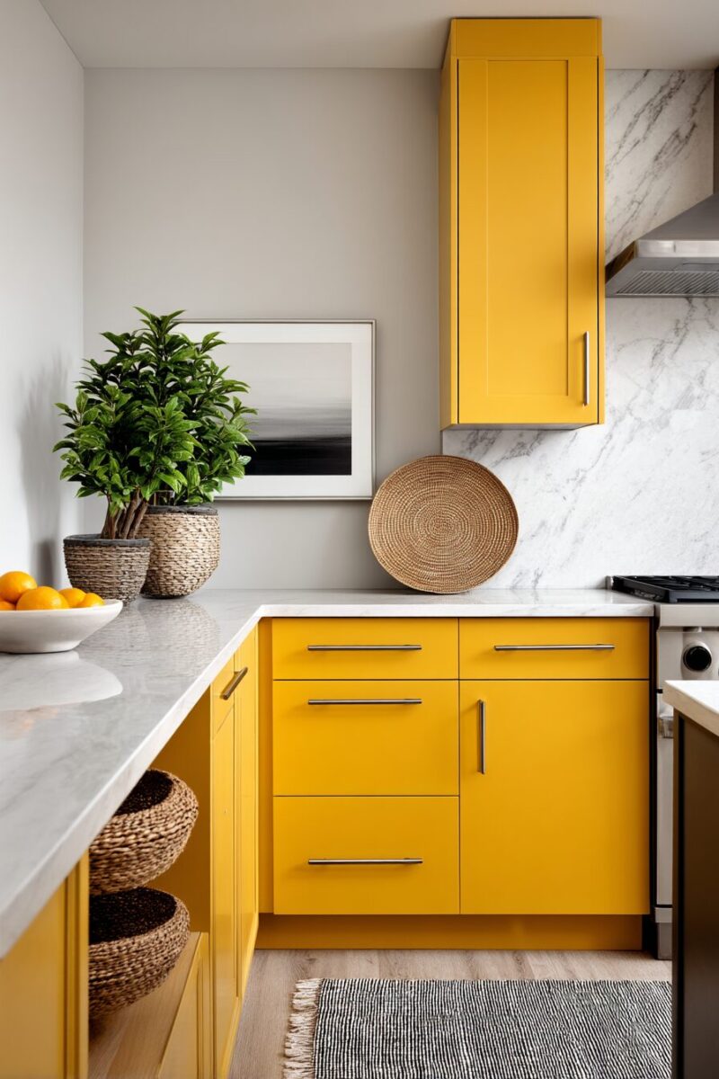 Pairing this yellow with thin, white quartz countertops enhances the minimalist aesthetic while providing practical, durable surfaces for everyday cooking.