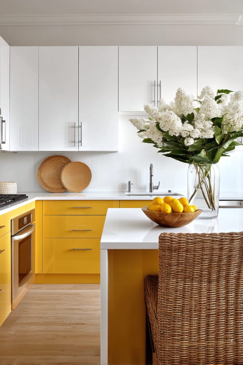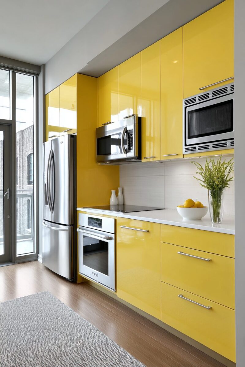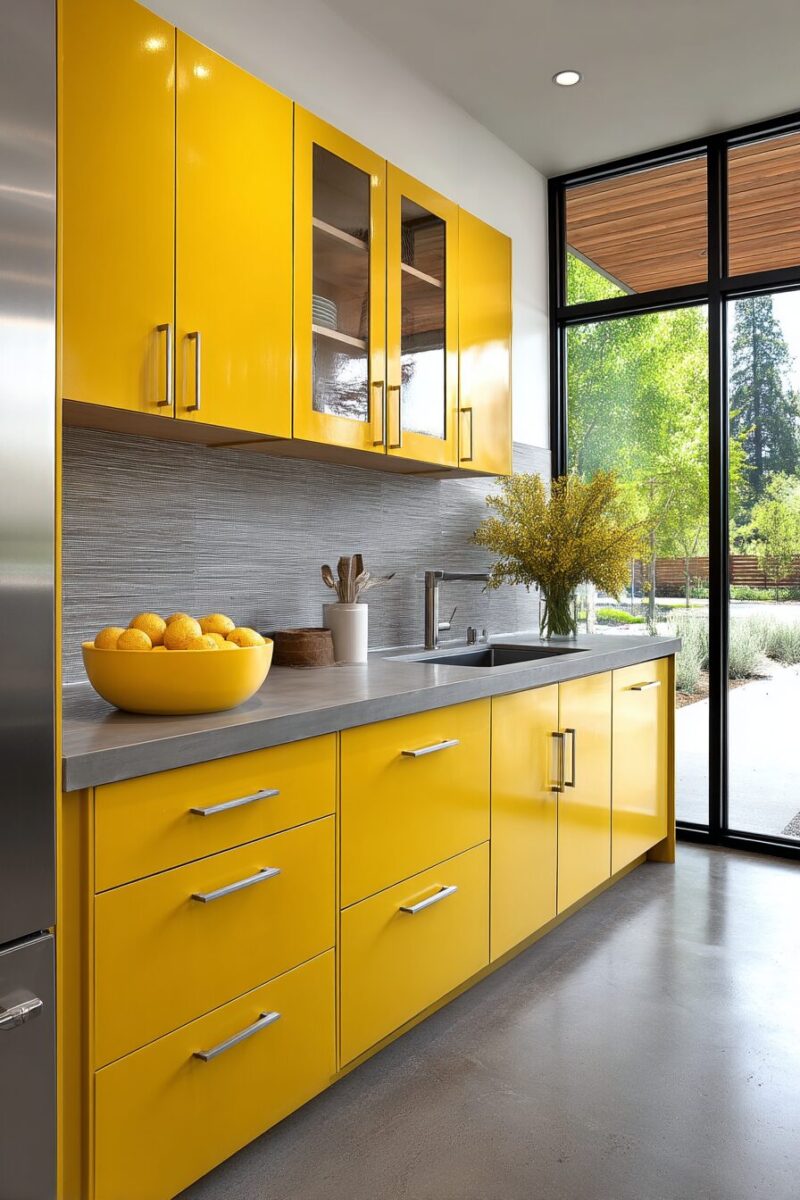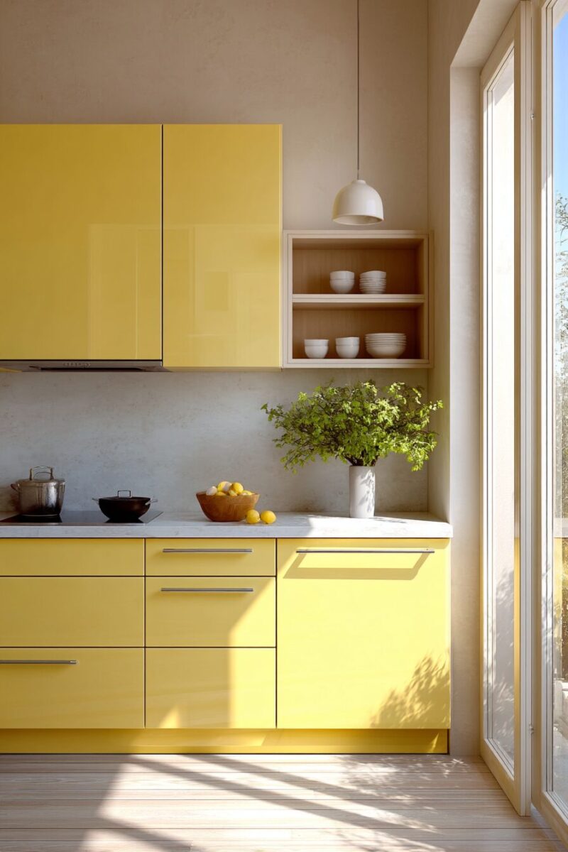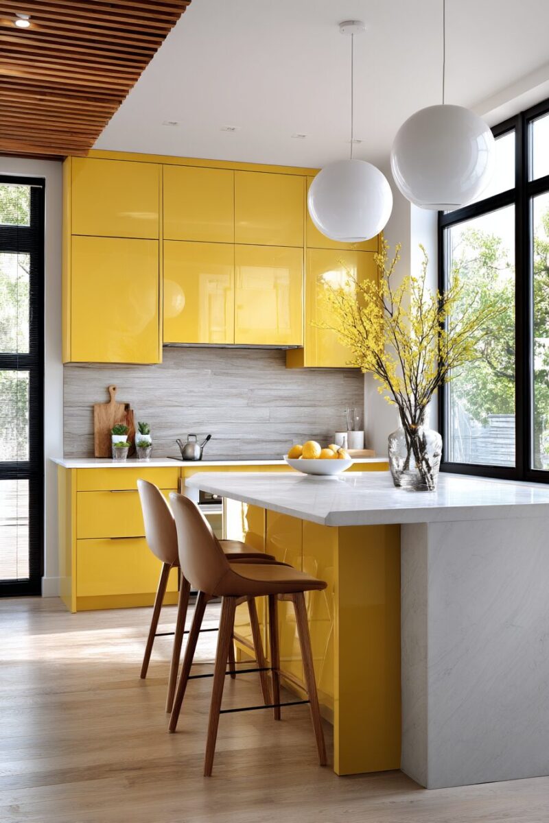 For maximum impact, consider high-gloss yellow on just one dramatic feature, like a kitchen island or a single wall of cabinets, allowing it to serve as the room’s exclamation point.