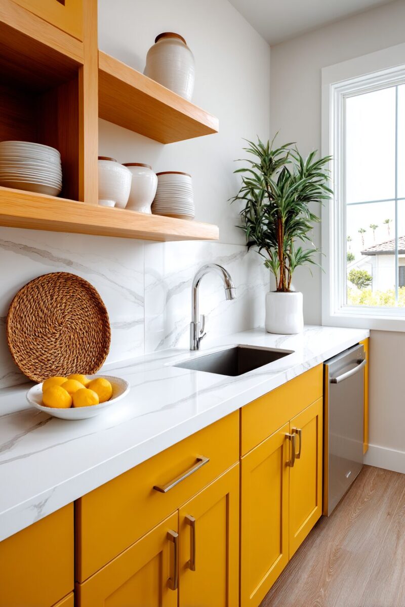 Wood elements like open shelving or a butcher block island introduce natural materials that complement mustard’s earthy undertones perfectly.