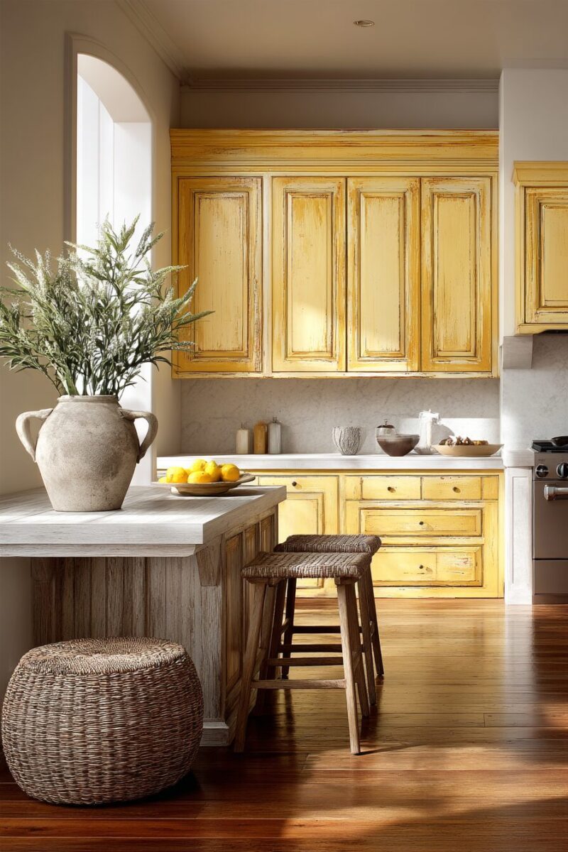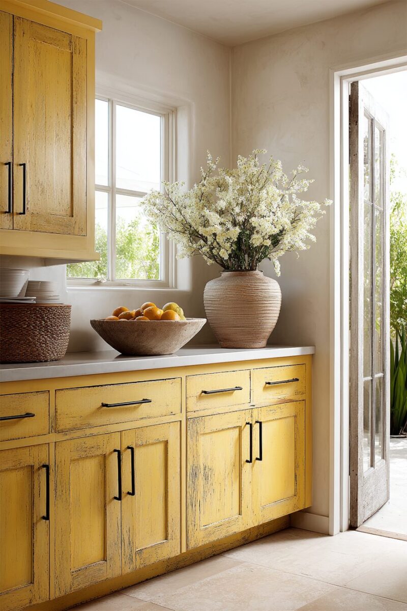 Distressed yellow cabinets bring delightful nostalgia to contemporary kitchens, channeling the warmth of grandmother’s kitchen without feeling outdated or kitschy.