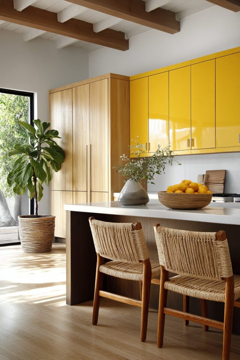 Combining yellow cabinets with natural wood elements creates a beautifully balanced kitchen that feels both colorful and grounded in nature.