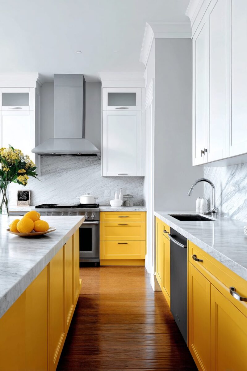 Most designers recommend yellow for base cabinets with white uppers, creating a grounded look that doesn’t make the room feel top-heavy or closed in.