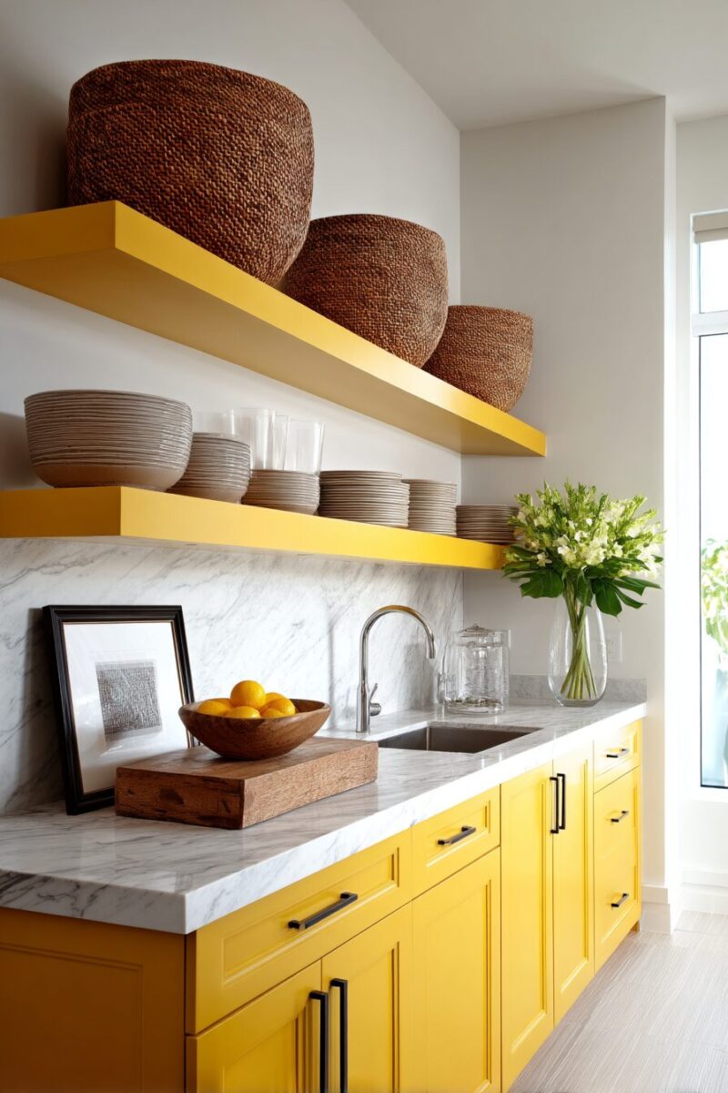 For balance, introduce repetitive elements on yellow shelves that create rhythm – perhaps a collection of matching canisters or consistently colored cookbooks.