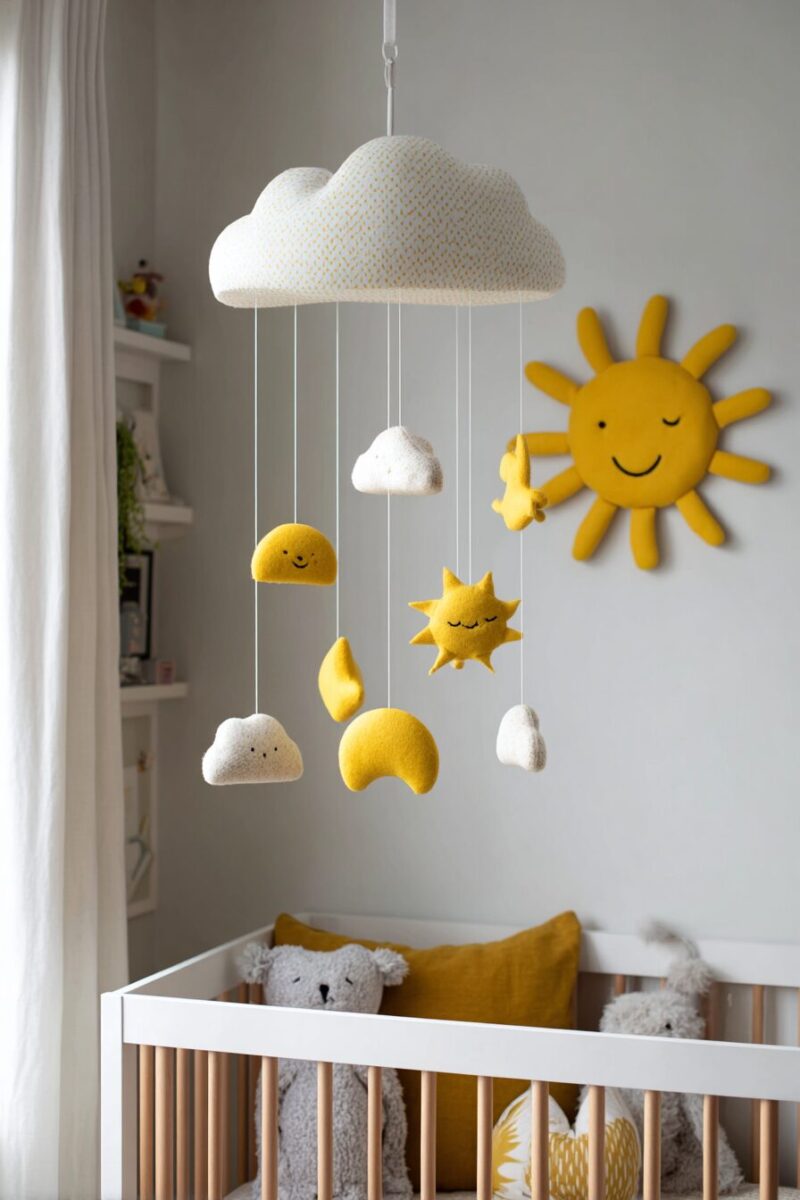 Sunshine-themed mobiles and wall art bring movement, beauty, and symbolic meaning to nurseries while capturing the life-giving energy that sunshine represents.