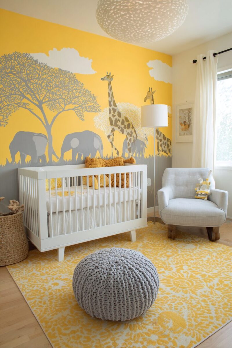 A yellow animal safari theme brings adventure and wonder to nurseries while introducing children to the magnificent creatures that roam sunny African savannas.